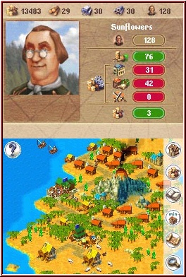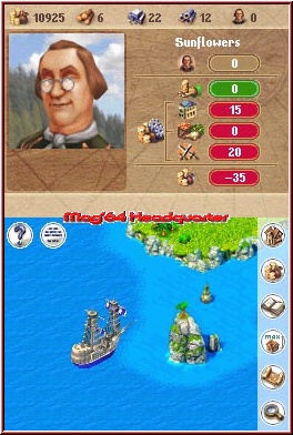 Was auch fast schon nicht erwähnt werden muß ist die Tatsache das Ihr ab dem Start euer Spiel jederzeit und punktgenau Speichern könnt. Etwas das natürlich ebenfalls die Spielmotivation immer hebt. Sobald Ihr also den ersten Vorspann hinter euch habt zeigt sich das Gameplay in seiner Anfangsform. Dabei ist nun das erste Kapitel eigentlich fast ausschließlich ein Tutorial. Zur Verfügung steht euch dabei ein sogenannter Berater, der euch zwar das ganze Spiel über begleitet, aber hier am Anfang eine mehr als wichtige Rolle spielt. Im Top Screen als Bild dargestellt stellt er euch Aufgaben und gibt euch über alles Informationen, was im Verlauf wichtig ist. So bekommt Ihr anfangs Aufgaben gestellt, die Ihr einfach abarbeiten müßt und Schritt für Schritt an das Gameplay herangeführt werdet. Wer das erste mal mit einem solchen Spielinhalt zu tun hat wird das Tutorial durchaus als etwas überladen betrachten. Dazu sind es einfach sehr viele Möglichkeiten, die erstmal alle unter einen Hut gebracht werden wollen. Liegt auch daran das selbst im Tutorial niemand auf euch wartet, sprich beim Lernaktionen die Zeit oder so angehalten wird. Grundlage des Spiels ist ein Schiff mit dem Ihr nach einer geeigneten Insel sucht auf der es sich lohnt eine Kolonie zu erreichten. Später kommen hier noch Dinge dazu, was die Wahl der Insel beeinflußt, die wir am Anfang noch nicht beachten. Dabei spielt sich nun was die Screen Aufteilung angeht alles in einem festen Gefüge. Dient der Touch Screen für die Darstellung der eigentlichen Spielaction samt dem kompletten Bedienen der Menus und Aktionen eurerseits, so ist der Top Screen eure Infozentrale für alles was wichtig ist. Zu allem was Ihr also unten anklickt erscheinen dann oben weiterführende Informationen. Erste Aufgabe ist es nun ein sogenanntes Kontor zu Errichten. Einmal dient es als Lager und zum anderen hat dieses Gebäude einen Einzugsbereich.