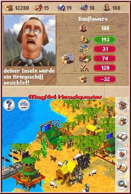 Wobei das ganze auch im Gegenteil funktioniert. Reichen z.b. eure vorhandene Plantagen oder sonstigen Gebäude für Wirtschaftsgüter nicht aus, könnt Ihr diese auch mehrfach upgraden. Pro Zivi Stufe geht das und erweitert die Produktivität oder die Lagergröße. Wieder einhergehend mit mehr Unterhaltskosten. Man kann auf alle Situationen im Spiel reagieren. Teilweise auch bei den Auseinandersetzungen. Manche Nachbarn, das können durchaus auch Eingeborene Völker sein wollen vielleicht einen Tribut oder bieten euch Hilfe an. Also gibt es auch dafür ein Menu um Tribute zu zahlen oder im Gegenzug selber benötigte Dinge zu bekommen. Zwar kann man alle Produkte auch selber nachkaufen, nur ist das immens teuer und nicht das erstrebenswerteste Ziel. Einzig um kurzfristig einen Engpaß zu beheben sinnvoll. Wollte man alles im Spiel mal ansprechen, auch dieser Test wäre eine kleine Doktorarbeit. ;-)) Selbst bei den Gebäuden und Menus bin ich bei weitem nicht auf alles eingegangen. Ein bißchen was wollt Ihr auch noch entdecken. Aber innerhalb der 10 Baurubriken stehen euch gut 50 Möglichkeiten zur Verfügung, wenn Ihr alles mal freigeschaltet habt. Und alles hat einen Sinn und Hintergrund. Mit der Zeit kann eure Insel garnicht groß genug sein und Ihr müßt zwingend neues Land entdecken. Das macht einen dermaßen großen Spaß das man hier locker die Zeit und alles andere vergißt. Positiv das euch der Berater immer auf dem laufenden hält. Wenn es irgendwo brennt, die Pest ausgebrochen ist oder eine Naturkatastrophe sich anbahnt, Ihr wißt wo und was zu tun ist. Wie Ihr reagiert ist dann eure Sache. Man hat nie so richtig Ruhe. Da läuft es vielleicht eine ganze Weile richtig gut und man erfreut sich an sprudelnden Steuereinnahmen um plötzlich Probleme zu bekommen. Alles passiert auch logisch und ist nachvollziehbar. Wirtschaftssysteme wie man sie sich vorstellt und wie sie auf dem DS so auch die Siedler nicht hinbekommen.