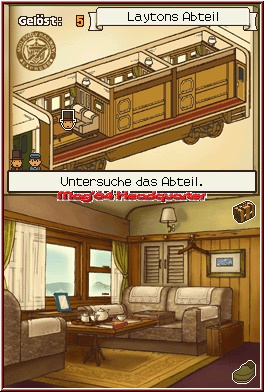 Durch die Umgebungen wandert Ihr nicht etwa mit dem Steuerkreuz, sondern durch Berührung eines Schuh-Symbols. Über Pfeile geht es dann in alle Himmelsrichtungen, auf dem Topscreen erscheint eine Karte, die Euch die Gegend von oben anzeigt. Das Spiel greift Euch unter die Arme, in dem es angibt, was als nächstes zu tun ist. So wisst Ihr etwa, dass Ihr erst einen bestimmten Zugabteil besuchen müsst, ehe es weitergeht. Hier noch ein Gespräch geführt, dort noch zu einem frischen Rätsel eingeladen und schon wird die Storyline in neue Bahnen gelenkt, es geht im Spiel voran.