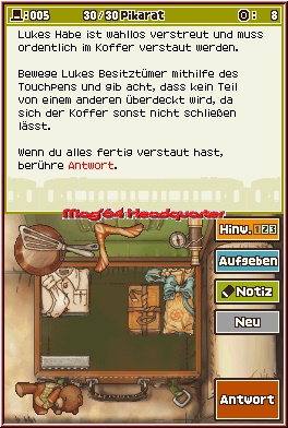 Das unschlagbare Duo, das im Grunde gar nicht zusammenpassen will, ist Meister im Knobeln. Als Spieler bewegt Ihr Euch durch hübsch gestaltete Landschaften, erforscht Städte und Züge, Häuser und Marktplätze. Mit Hilfe des Touchpens sucht Ihr jeden Winkel ab, tippt auf verdächtige Stellen und stoßt so nach und nach auf eben besagte Rätsel, die Euer Hirnstübchen zum Kochen bringen werden. Viele Rätsel ergeben sich auch erst innerhalb von Gesprächen, während Eurer Nachforschungen – oder aber per Zufall. Der Titel gestaltet sich im Großen und Ganzen recht linear, großartig „hängen bleiben" könnt Ihr nicht. Außer, Ihr knackt die Knobeleien nicht. Ob Verschieberätsel, logische Denkaufgabe, Kombinationsrätsel oder vertracktes Schachtelquiz – alle der Denkeinlagen sind vorbildlich gestaltet, einfach erklärt und fordernd. Ok, habt Ihr das Spiel einmal durch, wird es keinen Grund geben, es erneut in die Hand zu nehmen, nur etwa dann, wenn Ihr neue Rätsel über die Download-Funktion herunterladen wollt – wöchentlich kommen neue dazu! Klasse!