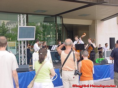 Soweit zu den Fakten und wichtigsten Besucher Infos der Messe. Eine echte Überraschung und ein wahrer Kunstgenuß wurde den anwesenden Journalisten aber auch geboten. Kaum war die Pressekonferenz vorbei platzierten sich direkt neben uns die Kammerphilharmoniker des Gewandhauses und gaben 2 Stücke zum besten. Vor allem das 2. Stück, das Zelda Medley war echt der Hammer. Ich habe jetzt noch eine Gänsehaut. Im Konzertsaal klingt das ja schon genial. Wenn das ganze aber nur ein paar Meter von einem entfernt gespielt wird verfehlen die Klänge ihre Wirkung nicht. Auch später auf der Showbühne draußen vor dem Gewandhaus spielten sie erneut dieses und andere Stücke und lockten so vor allem Leute im Alter von 50+ zu den Ständen. So verging die knappe Stunde erneut wie im Fluge und man konnte sich anschließend ein wenig seinem kleinen Hunger und Durst widmen. Ihr wißt ja wo es was kostenlos gibt sind die Jornalisten nicht weit. ;-) Da das ganze ab 12:00 Uhr für Besucher vor dem Gewandhaus startete füllte sich der Platz erst nach und nach. Ich glaube vielen unter euch wird das Auge tränen wenn ich erzähle das so die 4 Twilight Princess Stationen einige Zeit ohne Andrang einsam rumstanden. ;-) Interessant fand ich den Aufbau des ganzen. Schaute man von draußen vom Augustusplatz auf das Geschehen, so hätte man denken können Nintendo veranstaltet hier was allein. Denn weithin sichtbar waren nur die GCN und DS Stationen. Xbox, PS2 und PC Stationen war versteckter. Das Bühnenprogramm war eine Mischung aus kleinen Turnieren bei denen man immerhin Karten für die Fußball WM gewinnen konnte. Dazu hatte man Kicker vom lokalen Fußball Verein Lok Leipzig rekurtiert die gegen normale Gamer in diversen Spielewettbewerben antreten konnten. Unter anderem war auch Donkey Konga dabei, was schon allein bei vielen Zuschauern für Heiterkeit sorgte. Als dann das ganze auf Tanzmatten Spielchen ausgeweitet wurde könnt Ihr euch die Schadenfreude aller nicht direkt Beteiligten ja ausmalen. ;-) Übrigens haben die Lok Kicker den Kids gezeigt wo Bartel seinen Most holt. Denkt man garnicht.....