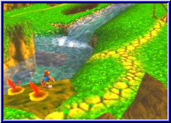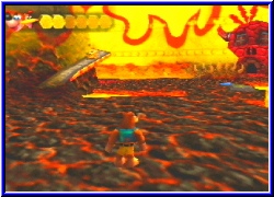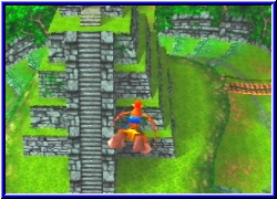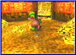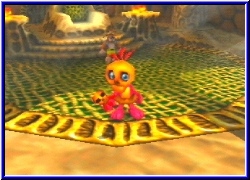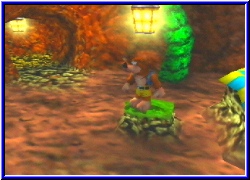 Dazu kommen weitere Charakter über die ich mich nicht auslassen will. Alle haben ein Problen und brauchen Hilfe. Manchmal müssen die beiden Helden auch in der einen Welt etwas aktivieren um es dann in einer ganz anderen zu Ende zu bringen. So ist das Spiel schon jetzt schwerer und immens umfangreicher als BK und DK. Und wenn ich mir überlege was alles noch vor mir liegt. Ich sags euch - einmal angefangen und man will nicht wieder aufhören. Ihr kennt ja den berühmten Satz "Nur noch schnell schauen was hinter der Tür ist". Das ist eigentlich schon das Todesurteil wenn man in Zeitnot ist. ;-) Das ganze wird nicht nur von der grafischen imposanten Kulisse unterstützt sondern bekommt durch unglaublich viele Sequenzen eine tolle Atmosphäre und Dynamik. Immer wenn Sie jemand neues treffen, bestimmte Bereich betreten wird in einem Sequenzgrafik umgeschaltet und man bekommt die altbekannten Laute beim sprechen zu hören. Ein Punkt in dem sich nichts geändert hat. Ich will garnicht daran denken was Rare mit diesem Potential an Spielbarkeit auf dem Cube macht. Aber wiegesagt grafisch ist man wirklich immer wieder überrascht was das N64 ohne Expansion Pak kann. Klare und deutliche Texturen und Gimmicks überall. Seien es Poster von den Jet Force Gemini Charakteren an der Wand. oder Bottles Familienmitgleider die tolpatschig, aber irgendwie zum knuddeln sind. Eine schüttelt und streichelt eine Donkey Kong Puppe , während der andere versucht einen Plastikflieger zum fliegen zu bringen. Viel Humor der alles auflockert. Es ist wieder ein Spiel bei dem man alles um sich herum vergessen kann und nur noch spielen will. Und natürlich gbit es auch wieder einige Boss Kämpfe . Das bekannte gepaart mit neuen Feature hatte schon bei Majoras Mask funktioniert und tut es auch hier. Bis jetzt finde ich keinen Kritikpunkt. Beim besten Willen nicht. Die Steuerung ist perfekt und gibt keinen Anlaß zur Kritik. Man kann speichern wann man will und behält alle gefundenen Dinge, die man auch hier wieder per ausladendem Pausenmenu abrufen kann. Ihr fragt euch jetzt sicher, was will der Kerl im 2. Teil zum Test noch schreiben. Laßt euch überrachen. Da kommt noch einiges auf euch zu. ;-)