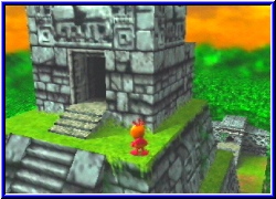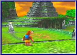 Es ist aber gerade der Sinn der dahinter steht. Später in der dritten Welt könnt Ihr einen Gegner nur besiegen wenn Kazooie den Air to Ground Move lernt und jetzt sogar im fliegenden Zustand per Fadenkreuz Ziele beschießen kann. Einfach irre. Wer denkt das wäre schon alles an neuem wird eines besseren belehrt. Und ich betone ich bin noch nicht durch mit dem Spiel. In der zweiten Welt, der Tempelwelt macht Ihr dann auch bekanntschaft mit einem weiteren neuen Feature. Nämlich die Möglichkeit Freund Mumbo zu steuern. Dazu müßt Ihr wieder seine Hütte finden, die in jeder Welt zu finden ist. Dort drinnen begrüßt er euch und bietet euch an das Ihr in steuern könnt . Aber auch hier nicht ohne Vorleistung. Es gilt die sogenannten Glowbos zu finden. Kleine Magische Figuren die Mumbo braucht. Danach kann man mit Mumbo durch das Level laufen , was natürlich auch seinen Sinn hat. Denn einmal findet man in jeder Welt einen sogenannten Mumbo Button . Tritt man man auf ihn und aktiviert ihn passiert immer etwas ungewöhnliches. In der Tempelwelt könnt Ihr einen goldenen Riesen erscheinen lassen und für ein gewisse Zeitspanne lenken. Nur er ist nun fähig bestimmte Türen zu öffnen und bestimmte Hindernisse zu überwinden. Das ganze ist immer wieder gepaart mit Rätseln die Banjo & Kazooie zu lösen haben und bringen eine selte erlebte Abhängigkeit in das Spiel. Nur warum findet man in jeder Welt 2 Glowbos?? Ganz einfach. Ein weiterer neuer Charakter wird präsentiert. Die Zauberin Humba Wumba . Gibt Banjo Ihr den zweiten Glowbo und springt danach in das Zauberbecken können sich beide Helden in jeder Welt in irgendwas transformieren. Sei es in einen kleinen Steincharakter , der nur in dieser Form bestimmten Personen Geheimnisse entlockt. Auch ist es z.b. nur in dieser Form möglich eines der vielen Minispiele zu spielen. Hier im Beispiel gilt es Kick Football zu spielen, was sicher später auch im 4Player Modus Spaß machen wird. Merkt Ihr was? So richtig aufhören will ich nicht. :-) Warum auch,es gibt immer noch mehr zu berichten um euch zumindest erstmal die Feature vorzustellen. Ein besonderes neues Feature das auch schon im Vorfeld bekannt geworden ist, sollte die Möglichkeit sein das sich Banjo & Kazooie trennen können. Kazooie sieht übrigens richtig nackt aus ohne ihren großen pelzigen Freund. Auch das lernen beide erst später im Spiel bei Jamjars. Dazu existieren wiederum Trenn Buttons um beide zu trennen. Denn wie oft findet man Türen die den Kopf eines der beiden zeigen und nur von einem allein betreten werden können. Es ist schon toll wieviele Dinge man beachten muß und was einen erwartet.