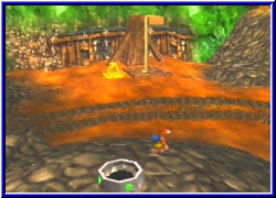 Denn draußen in der Dunkelheit, nicht unweit befindet sich das Verließ in dem Gruntilda ihre Verbannung verbüßt. Nur geschützt durch einen großen schweren Felsbrocken, der auf der Öffnung liegt. Langsam ertönt in der Ruhe der Nacht ern nervendes immer näher kommendes Geräusch, als sich plötzlich ein riesiger Bohrer durch die Felswand frißt. Am Ende öffnet sich dort eine Klappe und 2 nicht gerade minder häßlige Hexen kommen heraus. Mingella und Blobbelda, die Schwestern Gruntildas. Mit einem magischen Zauber zerstören sie den Felsbrocken und Gruntilda erblickt wieder das Licht der Oberfläche. Aufgeschreckt von diesen Geräuschen schauen unser Helden nach dem Rechten und müssen mit ansehen wir Gruntilda neue Pläne mit ihren Schwestern ausheckt. Gewarnt durch Mumbo verlassen die beiden Helden die Kartenspielrunde und retten sich aus dem Haus. Einzig Bottles denkt seine Freunde wollen ihn hinters Licht führen. Bei seinem guten Blatt will er den Spieltisch nicht verlassen. Ein verhängnisvoller Fehler. Denn Gruntilda kennt immer noch den Weg zum Haus von Banjo und Kazooie und läßt einen mächtigen Zauber über das Haus fegen. Im Glauben ihre beiden Peiniger von früher erledigt zu haben verziehen sich die 3 Hexen. Nur haben sie nicht Banjo oder Kazooie erledigt sondern den kleinen Bottles, der nun plötzlich als Geist den beiden Helden erscheint. Das reicht sagen sich Banjo& Kazooie und machen sich auf den Weg um den 3 Hexen das Handwerk zu legen. Bevor man jedoch sein Abenteuer beginnt kann man im Hauptmenu noch einiges einstellen. Wieder sind 3 Spielstände per Batterie vorhanden. Desweiteren kann man in den Options Dolby Surround einstellen sowie das 16:9 Format. Ebenfalls und schon DK 64 vorhanden ist die Möglichkeit alle erreichten Kämpfe, Sequenzen und Minispiele in einer Galerie immer wieder zu betrachten oder zu spielen. Wer den Punkt Auflösung vermißt dem sei gesagt das spätestens jetzt klar ist das DK64 meiner Meinung nach marketingtechnisch das Expansion Pak dringend benötigte. Denn Banjo Tooie sieht nicht nur besser aus, sondern benötigt kein Expansion Pak. Bei den Streifzügen durch die Welten und bestimmten Orten wird einem hier ein grafischer Glanz teilweise geboten das man sich fragt ob Rare einen Geheimcode benutzt. Ich denke die vielen Bilder werden euch von meinen Worten überzeugen. Auch werde ich immer wieder auf besondere grafische Dinge eingehen. In dieser Hinsicht stellt BT neben PD und S&P die Spitze auf dem N64 dar. Startet man ein Spiel findet man sich im ersten Bereich wieder, den man schon aus BK kennt.