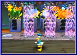 Nachdem der Vorspann die Geschichte erzählt hat gelangt man zum Hauptmenu , das euch die Auswahl zwischen einem neuen Spiel, dem Laden Bildschirm und den Options bietet. Spielstände werden bei Donald Duck auf Memory Card gesichert, wobei jeweils 3 Spielstände auf eine normale MemCard passen. In den Options kann man neben den soundtechnischen Dingen auch die HiRes Grafik einstellen, die das Spiel aufgrund seiner Expansion Pak Unterstützung bietet. Desweiteren kann man hier ebenfalls die Sprache im Spiel anpassen. Damit unser Held Donald überhaupt erstmal in Richtung Merlocks Tempel aufbrechen kann benötigt er die Hilfe eines guten alten Bekannten - Daniel Düsentrieb , der hier der einzige ist der Donald durch seine neue Erfindung helfen kann. Wählt man ein neues Spiel an gelangt man auch als erstes in Daniels Werkstatt und steht vor einer gar komischen Maschine, nämlich dem Düsentrieb Gamma Teleporter der Donald im Verlauf des Spiels an der verschiedensten Orte bringt. Denn bevor Donald zu Merlock kann muß diese Maschine aufgepowert werden. Nur leider benötigt Daniel dazu bestimmte Dinge die Donald vorher besorgen muß. So ist am Anfang auch nur einer der 4 Teleporter aktiv, die Donald im Verlauf des Spiels in die verschiedenen Level bringt. Und es sollten einige Dinge werden die Donald besorgen muß. Betritt Donald nun den ersten Teleporter gelangt man zum Levelhauptbildschirm ,der sich in jeder der 4 Welten gleicht. Vor euch sind auf einer kleinen runden Fläche 6 Kreise sichtbar. Dabei sind 4 Kreise die reinen Level, die Donald in Jump'n Run Manier hinter sich bringen muß. Am Ende ende steht einer seiner kleinen Neffen auf dem 5. runden Kreis, das sich im Verlauf als Bonuslevel entpuppt, das ebenfalls auf eine spezielle Art freigespielt werden muß. Der letzte und größte Kreis beinhaltet den Teleporter zum jeweiligen Endboss der Welt. Aber auch um dafür den Zugang zu bekommen benötigt Donald bestimmte Dinge. Sehr schön gemacht ist in diesem Zusammenhang das allerste Level. Betritt Donald hier in der ersten Welt den linken unteren Teleporter gelangt er zum Spiellevel. In diesem wird dem Spieler anhand von Beispielen alles wissenswerte gezeigt was es im ganzen Spiel später zu beachten gilt. So werden euch hier auch die Spielziele vorgestellt um alles im Spiel auch wirklich freizuspielen. Dabei bekommt man einen ersten grafischen und spielerischen Eindruck. Wie sich zeigen sollte bestehen die Level im Spiel aus 2 verschiedenen und immer wiederkehrenden Varianten. Dabei ist eines aber gleich. Donald Duck ist kein 3D Jumper wie BT oder DK.