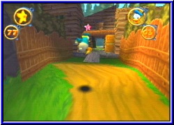 In beiden Varianten geht es einen fest abgesteckten und linearen Weg, was Rätselkost in diesem Spiel völlig ausbleiben läßt. Die erste Variante ist die in der Donald praktisch nach vorn in das Level hineinläuft. Ihr könnt hier weder nach links oder rechts, sondern seid völlig nach vorne orientiert. Dabei bekommt Ihr nach und nach die Spielziele gezeigt. Zum einen muß Donald in jeder der 4 Level pro Welt ein Boss Puzzleteil finden. Erst wenn er alle 4 gefunden hat wird der Teleporter zum Boss aktiv. Desweiteren sind im Level verteilt 3 Spielzeuge der Neffen versteckt, die von einem Zauber Merlocks festgehalten werden. Um diese Zauber zu brechen und die Spielzeuge einzusammeln muß Donald zu jedem Spielzeug ein dazugehörendes Zauberbuch finden und zerstören. Jetzt läuft eine Uhr mit wenigen Sekunden rückwärts in der er dieses Teil finden muß. So ist das Zauberbuch und das entsprechende Spielzeug nie weit auseinander. Auch die Boss Puzzleteile sind nicht allzu schwer versteckt, was sich fast über das gesamte Spiel sagen läßt. Um diese immer zu erreichen verfügt Donald natürlich über einige Fähigkeiten die sich übrigens in keinster Weise von der GBC Version unterscheiden. So auch die Haupteigenschaft, der Sprung der auch hier per zweimaligen A-drücken zum Doppelsprung mutiert. Zum einen gibt es auch hier keine Lebensleiste, sondern Donalds sogenannte Stimmungen. Im normalen Zustand springt er vergnügt herum. Wird er einmal getroffen wird er für ein paar Sekunden fuchsteufelswild und damit unverwundbar. Man sieht dies auch an einer Staubwolke um ihn herum. Danach läuft Donald schlecht gelaunt durch das Level, was man daran sieht das er seine Mütze nach vorn geschoben hat und demenstprechend schaut. Die 4. Fähigkeit, den Super Donald bekommt er nur wenn ein entsprechendes Item aufsammelt. Jetzt wird er für eine gewisse Zeit unglaublich schnell und stark und kann so einiges an Gegnern vermöbeln. Nachteil der ganzen Sache ist das Donald maximal 2 Treffer einstecken kann. Danach ist ein Leben weg. Die Anzahl der Leben wird euch rechts oben im Screen immer dargestellt. Schräg drüber findet man das Bild mit dem momentan Zustand Donalds. Links im Bild sieht man eine sogenannte Sternenanzeige. Diese Sterne liegen verteilt in den Leveln herum und haben verschiedene Wertigkeiten. Sammelt Donald davon genügend ein bekommt er ein Extraleben gutgeschrieben. Ebenso sind natürlich Extraleben in Form kleiner Donaldköpfe zu finden. Drückt man während des Spiels die R-Taste kann man sich immer ein Bild machen wieviele der 3 Spielzeuge man gefunden hat und ob man das Boss Puzzleteil schon gefunden hat.