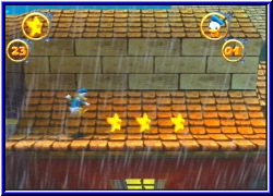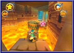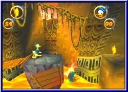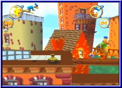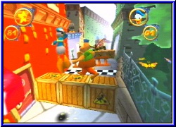 Ein Vorteil des Spiels ist das man jedes Level immer wieder besuchen kann und es außer bei den Spielzeugen keine Zeitlimits gibt. Die zweite Variante der Level ist eine reine 2D Ansicht in der Donald in einem Pseudo 3D Umfeld von links nach rechts hüpft und nach dem rechten sieht. Auch hier sind die gleichen Spielziele enthalten wie in der anderen Variante. In jeder der 4 Welten sind jeweils 2 der beiden Levelvarianten zu spielen. Thematisch unterscheiden sich alle 4 Welten stark voneinander, was vor allem grafische Abwechslung verspricht. Geht es in der ersten Welt durch Wälder, in der zweiten durch die Straßen von Entenhausen über Gundel Gaukeleys Schloß bis hin zu Merlocks geheimen Tempels. Dabei kommen alle Jump'n Run typischen Dinge vor. Donald muß springen, Gegner ausweichen, sie erledigen und unmengen an Etagen hinter sich bringen. Überall gibt es kleine Fallen in Form von Abgasrohren die zeitweise Rauch speichen und die Donald versuchen sollte zu vermeiden. Abründe die nur über drehende Plattformen zu überwinden sind oder Kombinationen aus Gegner und Hindernissen. Hier ist Donald sehr Bodenständig und bringt in dem Sinne nichts innovatives mit. Neu und ungewöhnlich sind im Spiel andere Dinge. Schafft es Donald alle Spielzeuge einer Welt komplett zu finden macht einer der Neffen den Teleporter frei auf dem er steht und es gilt ein Bonusspiel hinter sich zu bringen. Das ist Hektik pur. Hier tritt Donald in einem Art Wettrennen gegen eine typische Sache der jeweiligen Welt an. Dabei rennt und steuert man Donald so das er im Bild auf einen zu rennt. Dabei wird er unaufhörlich verfolgt und man darf sich keine Pause gönnen. Angenehm ist in diesem Fall wie auch in den normalen Leveln, das relativ viele Rücksetzpunkte in den Leveln verteilt sind. Wird Donald erwischt, erleidet zuviele Treffer oder stürzt in einen Abgrund beginnt man somit am letzten Rücksetzpunkt. Auf jeden Fall finde ich diese Dinge recht spaßig. Kennt man aber den Weg ist es so schwer nicht. Mal geht es gegen einen Bären , gegen die Panzerknacker Bande die euch in ihrem Wagen verfolgt, eine magische Hand die euch durch Gundels Schloß jagd oder der Kopf einer Statue im Merlocks Tempel. Allen gemein ist das Ziel dieser Bonusspiele. Schafft Ihr es das Ziel zu erreichen erscheint Gustav, Donalds alter Rivale um Daisy und fordert euch zu einem Wettstreit. Jetzt könnt Ihr zusätzlich alle Level pro Welt nochmal nach Zeit durchspielen ohne auf irgendwelche Items zu achten. Dabei müßt Ihr Gustavs Zeiten unterbieten um erfolgreich zu sein. Auch das ist interessant und in den späteren Welten auch nicht unbedingt leicht. Belohnung dafür ist das Ihr von Gustav Kostüme bekommt, die aber mehr als Gimmick anzusehen sind.