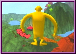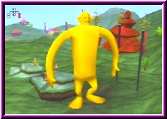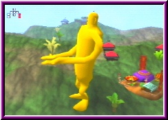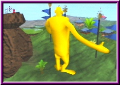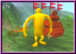 64DD Titeln nichts mehr im Wege. Die ersten beiden Titel, die zeitgleich mit dem 64DD auf den Markt kamen waren Mario Artist und eben Doshin. Dabei stellt Doshin the Giant eines der ungewöhnlichsten Spiele auf dem N64 dar. Keine Action, keine technischen Spielereien, sondern ein ruhiges und entspannendes Aufbauspiel. Eigentlich könnte man nach dem Einschalten angesichts einer schlechten grafischen Präsentation gleich wieder ausmachen. Aber Doshin hat einen ganz eigenen Reiz, der sich dem Spieler erst im Verlauf der Zeit einstellt und der zugegebenermaßen auch mich erfaßt hat. Für mich als Freund von Aufbauspielen sollte Doshin einen gewissen Spaßfaktor bieten. Im groben kann man Doshin the Giant mit den Siedlern auf dem PC vergleichen. Allerdings mit einigen Unterschieden. Nachdem die Disk im 64DD verschwunden ist meldet sich der Startbildschirm , der im Falle von Doshin wenig aussagekräftig ist. Nicht nur aufgrund der japanischen Sprache. Nach einigem Ausprobieren, was nun was bewirkt beginnt man mit dem Spielstart. Doshin the Giant ist ein Aufbauspiel, das in Zyklen von Tagen unendlich gespielt werden kann. Ähnlich wie in MoM spielt also die Zeit eine Rolle. Held des Spiels ist der Riese Doshin, der nicht nur komisch aussieht sondern auch mit einer gar niedlichen Japanischen Stimme ausgestattet ist. Eines der positiven Feature im Spiel. Nämlich die Sprachausgabe. Nicht nur Doshin selber quasselt, sondern auch ein Beobachter, der am linken unteren Bildrand sich immer wieder einschaltet und wie ein Wasserfall redet. Durch die Möglichkeiten des 64DD bekommt man hier nicht nur unglaublich viel Sprachausgabe zu hören, sondern auch die meiner Meinung nach beste Qualität der Sprache. Spielort ist eine Inselgruppe , die von unglaublich viel Wasser umgeben ist. Auf den vereinzelten Landabschnitten leben 4 verschiedene Völker, die man zu Beginn nur an ihren farbigen Mützen erkennt.