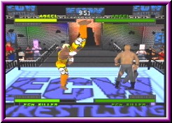 | So jeder hat seine Vorstellungen von seinem Wrestler. Sollte diese mit den mitgelieferten nicht erfüllt werden, kann man sich kurzer Hand einen selber erstellen . Zahlreiche Möglichkeiten tun sich unter diesem Menupunkt auf. Jegliche Körperformen und - Farben, Kopfeinzelheiten, Tatoos, Brillen, Masken und Trikots können angepasst und aufeinander abgestimmt werden. Das gilt natürlich für beiderlei Geschlecht. Und wer zuzüglich noch einen Schriftzug auf seinem Klamotten zeigen will, der kann das natürlich auch tun. Über das persönliche Kampfverhalten, die Beliebtheit und diverse Kampfattribute darf man selbstredend auch selber entscheiden. Nun sollte man ihm auch noch einige Moves zuordnen, um im Ring auch bestehen zu können. Entweder man übernimmt die Moves eines anderen Fighters 1 zu 1, oder man schöpft sich von allem den Rahm ab und sucht sich die besten und effektivsten Moves zusammen. Im Schnitt hat jeder Wrestler 24 Moves unterschiedlichster Wirkungsgrade. Man sieht links den Wirkungsgrad, daneben den Namen und rechts die Tastenkombi. Man sollte hier schon den Grundstein für eine erfolgreiche Karriere legen und sich die besten Moves zuschustern. Ist man mit seinem Prügel zufrieden, speichert man diesen auf MemCard (26 Pages). Nun kann man im Exhibitionmode erst einmal Erfahrungen sammeln und das anwenden unterschiedlicher Moves üben. Dafür stehen euch 15 Game Modes zur Auswahl wie vs., Tag Team Match, 8 Man Tag Team oder auch die Battle Royal. Dabei unterscheidet sich, ob hinter dem jeweiligen Mode ein Sternchen steht. Kämpft man im vs. Mode normalerweise gegen einen Gegner, so kommen bei dem vs. Mode mit Sternchen jeweils noch drei Gegner danach, oder es finden sich verschiedene Schlaginstrumente im Ring wieder. Wobei es sich um Dinge wie Koffer und andere harte Gegenstände handelt. Hat man sich für einen Mode entschieden, gelangt man zur Spielerauswahl , wo man nun endlich seinen Mann/Frau ins Feld führen kann. Nach der Gegnerwahl, legt man nun die verschiedenen Einzelheiten fest. Soll es ein Käfigmatch werden oder ein Deathmatch? Wie will man den Sieger ermitteln? Beim ersten Blut, oder per I Quit oder normal per Pin? Hier legt man auch die Arena fest, in der gekämpft werden soll. Die Kampfzeit kann eingestellt werden von einer Min. bis hin zu 1 Std. Oder wir machen den Fight ohne Zeitlimit. Ist der Startschuß gefallen, sehen wir die Kämpfer beim Einmarsch. Nachdem nun jeder noch einen dummen Spruch gemacht hat, kann es endlich fetzen. |