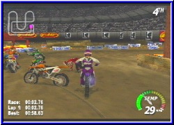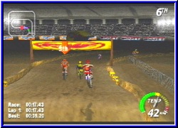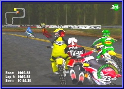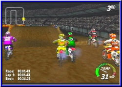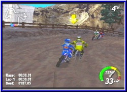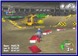 Dabei werden euch bei jeder Aufgabe Texte eingeblendet was zu tun ist. Während des fahrens wird euch jeder Schritt erklärt. Ihr müßt dann jede Aufgabe erfolgreich abschließen um zur nächsten zu gelangen. Am Schluß jedes Aufgabenbereiches müßt Ihr gegen die Zeit zeigen was Ihr gelernt habt. Einen besseren Übungsmodus gibt es nicht. Zwar investiert man doch einiges an Zeit, aber es lohnt sich. Und das muß es auch. Denn Excitebike fordert euch in den höheren Klassen sehr und darf auch gern als schwer bezeichnet werden. Doch dafür sorgen nicht nur die gegnerischen Fahrer. Wer also die Übungsrunden hinter sich hat oder denkt er kommt auch ohne zurecht kann sich an der ersten Meisterschaft versuchen. Jede der drei Meisterschaften ist in verschiedene Cups unterteilt. Im Novice warten der Bronze und Silver Cup, im Amateur kommt Gold dazu und im Pro schließlich gilt es noch Platinum und einen Challenge Cup zu schaffen. Dazu kommen weitere Überraschungen, die es zu erfahren gilt. Jeder dieser Cups ist nun in 5 Rennen unterteilt. Dabei wird immer gemischt. So müßt Ihr euch abwechselnd auf Outdoor und Indoor Strecken bewähren. Nach jedem Rennen werden Punkte verteilt. Um den jeweils nächsten Cup erstmal anwählbar zu machen müßt Ihr in der Gesamtabrechnung aller 5 Rennen erster sein. Soweit die Theorie.