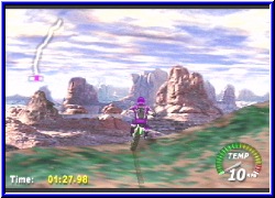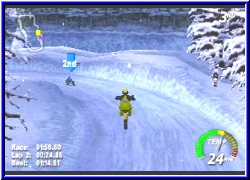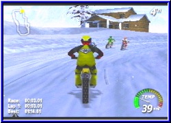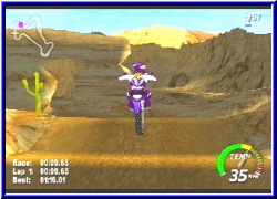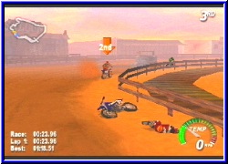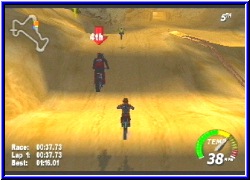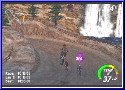 Um in den Rennen selber nicht die Übersicht zu verlieren hat man einen Streckenquerschnitt eingebaut auf dem alle Fahrer durch farbige Punkte gekennzeichnet sind. Auch der nächstbessere platzierte vor euch ist gekennzeichnet und hat die Zahl über sich, so das Ihr wißt wer euer nächstes Opfer ist. All diese Feature machen aus dem Spiel einen kleines Suchtvergnügen. Denn perfekt fährt man nie. Irgendwas gibt es immer zu verbessern. Und sei es nur die Zeiten. Aber dafür habt Ihr ja auch den Time Trial mit dem besagten Ghost Feature. So kann man sich auch immer selber jagen. Ein dickes Lob gibt es für die grafische Gestaltung. Weniger für die Indoor Strecken die auch toll aussehen, aber nunmal Grenzen bei der Gestaltung haben. Dafür aber die Outdoor Strecken, deren Hintergründe und Texturen oft an Fotorealismus erinnern. Sehr viel Details an den Strecken wie Fahrzeuge, Häuser, Wasserfälle oder sei es auch nur der Untergrund. Ob im verregneten Urwald über sandige Wüstenpisten bis zu verschneiten und vereisten Strecken. Für alle ist was dabei. Dabei ist die Framerate sehr konstant. Teilweise gibt es zwar angedeuteten Nebel. Aber nur entfernt und nicht störend. Das einzige was man vor allem in den Indoor Strecken manchmal bemängeln kann ist die Kamera, die ab und zu ein bißchen macht was sie will. Nicht schlimm, aber nicht immer optimal. Was auf den Outdoor Strecken dazu kommt sind viele Abkürzungen. So kann man einmal z.b. mit dem richtigen Timing über 2 fahrende Züge springen und so erheblich abkürzen. So findet man auf jeder Strecke diverse Abkürzungen, die aber meist auch ein gutes Feeling für das Bike erfordern. Am meisten schmunzeln muß man immer auf der Sandstrecke, in der ein Extremsprung eingebaut ist.