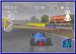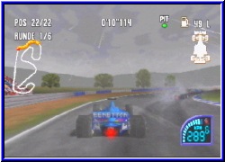 Wieder habt Ihr 7 verschiedene Kameraperspektiven zur Verfügung um den Wagen zu steuern, wobei mir wie bei RS2 die etwas über dem Wagen befindliche am meisten zusagte. Auf dem Bildschirm informieren euch reichlich Anzeigen über alles wichtige im Rennen. Ob die Spritanzeige, Tacho, Schadensanzeige bei aktivierter