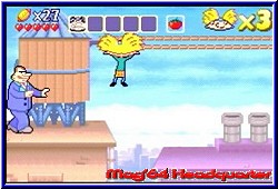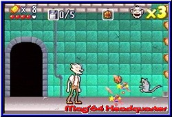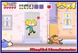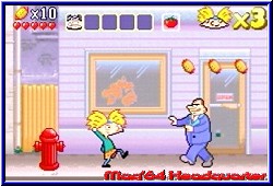 Sofort am gleichen Ort geht es weiter, besitzt jetzt aber nicht mehr eventuell aufgesammelte Power Up's. Etwas das Abwechslung in das Gameplay bringt. Denn neben dem überwinden von Plattformen, hangeln an Seilen oder ausweichen von Gegnern kann der Spieler verschiedene Upgrades finden. Zum einen solche die die Fähigkeiten verbessern. Arnold & Co können schneller laufen, höher springen oder verbessern so die Wirkung der Geschosse. Auch diese gibt es in Upgrade Varianten. Zu Beginn kann Arnold sene Gegner mit einm Kaugummi anschießen was diese nur kurz bewegungsunfähig macht. Später findet man bessere Dinge die Gegner auch vollkommen vom Screen fegen. Angezeigt ebenfalls im Screen kann man unter den verfügbaren auch durchschalten. Wobei ein Unart im Spiel schon enthalten ist. Der Spieler kann in den Leveln sehr oft Türen und damit Räume betreten. Kleine Abzweige die nur kurz für Ablenkung vom recht linearen Spiel bieten. Geht man in so einen Raum und gleich wieder hinaus sind draußen alle Gegner, die man eben erwischt hat sofort wieder da. Das kann nerven und teilweise auch unfaire Momente bringen. Vor allem wenn es sich um schnelle Gegner wie Hunde oder Katzen handelt die Arnold bei Berührung ein Herzteil abziehen. Das Scrolling im Spiel ist sehr sauber und gibt keinen Anlaß zur Klage. Die Musik im Spiel ist an die Serie angelehnt. Ganz unbekannt vom Zappen ist auch mir die Serie nicht. Wie ich immer sage. Videospielen bildet auf die verschiedenste Weise. ;-) Grafisch hat man es ebenfalls verstanden ein ordentliches Spiel auf die Beine zu stellen. Klare Umgebungen, die hier und da durch Animationen glänzen wissen zu gefallen ohne den GBA auch nur annähernd auszunutzen. Alles immer angelehnt an die Original Trickfilmserie. Für einen älteren Spieler ist das Game aber zu leicht und zu linear. Im Zeitalter der Mario Spiele oder eines Rayman darf man also hier keine große Komplexität erwarten. Hier bin ich aber der Meinung das für die jüngeren Spieler das Spiel nicht verkehrt ist. Da auch die Steuerung selber einfach, aber gelungen umgesetzt wurde. Es gibt viele Beispiele wo man selbst für diese Zielgruppe die Gradwanderung zwischen Gameplay und Schwierigkeitsgrad nicht hinbekommen hat. Hier ist dies nicht so. Hey Arnold ist ein solides Jump'n Run für die jüngeren Spieler und Fans der Serie, die ihre Helden so auch mal anders erleben und selber steuern können. Für die kann man es locker empfehlen, da sich das Spiel hier keine Schwächen leistet. Ältere Spieler haben auf dem GBA andere Varianten mit denen sich mehr als genug die Zeit vertreiben läßt. |