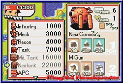Die Einheitenvielfalt setzt sich aus den identischen Truppen des ersten Teils zusammen. Mit einer Ausnahme : dem Titanpanzer. Rein äußerlich sieht er wie ein Betonmischer aus, doch besitzt er eine ordentliche Feuerkraft. Leider muß man die Baupläne für dieses Geschoß erst finden. Und zwar für jedes Land neu. Sprich, wer den Bauplan bei Orange Star gefunden hat, kann den Titanpanzer für alle Orange Star Truppen bauen. Doch Blue Moon Truppen können davon nicht profitieren, ehe sie nicht selbst diese Pläne entdeckt haben. Und es gibt keinen Hinweis darauf, wo sie liegen. Man muß ein bestimmtes Gebäude in einem Level besetzen und dann kommt die Meldung, das etwas gefunden wurde.