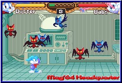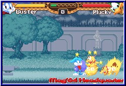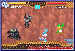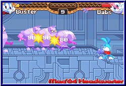 In regelmäßigen Abschnitten besuchen die Tiny Toons den GBA. Dabei nutzt man die Lizenz gerne bis zum letzten aus. Was man auch hier wieder sieht. Jumper sind mittlerweile aus der Mode könnte man meinen. Deshalb darf die angepeilte jüngere Zielgruppe nun in einem Scroll Prügler Hand an Buster & Co legen. Namensgeber Buster liegt eines Tages entspannt auf der Wiese der ACME Uni und schmökert in seinem Lieblingsmagazin. Unversehens trifft Buster ein Boxhandschuh. Grund des Übels ist Montana Max, der wieder böses im Schilde führt. Benommen wie Buster jetzt ist kann Montana seinen Plan umsetzen und versucht seinen neuen Traumstrahler an Buster. Just in diesem Moment laufen natürlich die anderen Toons in den Strahl des Traumstahlers und finden sich in den Träumen des kleinen Buster wieder. Natürlich sind Busters Träume alles andere als friedlich und er und die anderen Toons müssen schleunigst dieses Spielchen beenden und Montana Max das Handwerk legen. Nette Story, die dem Spieler nach dem Einschalten als auch während des Spiels in Form kleiner Standbilder gezeigt wird. Positiv das als Sprache auch deutsch gewählt werden kann. Das Hauptmenu bietet dem Spieler einzig die Punkte Start, Fortsetzen und die Optionen für den Sound und den Schwierigkeitsgrad, den es in 3 Stufen gibt und über den noch zu reden sein wird. Beginnt man ein neues Spiel liegen vor dem Spieler 4 Welten mit 16 Leveln, die durch Paßwörter gesichert werden. Ziel in jedem Level ist es von links nach rechts laufend prügeln den vielen Gegner den Garaus zu machen. Dazu stehen Buster zunächst eigene Mittel zur Verfügung. Neben springen kann er per B Taste schlagen und durch Steurkreuzrichtungen dies auch in mehreren Varianten. Vom Kinnhaken über den Powerschlag bis zu einer Luft Attacke. Dabei sind auch Kombos mit bis zu 5 Schlägen hintereinander möglich. Desweiteren verfügt er über 2 Spezialattacken, die über eine Energieleiste in der Mitte oben im Screen "gefüttert" werden. Damit kann Buster auch Gegnerscharen mit einer Attacke bekämpfen. Links oben ist Busters eigene Energieleiste angebracht. Ist diese leer muß das Level von vorn begonnen werden. Leben in dem Sinne gibt es im Spiel keine. Wesentlich wichtiger ist die rechte obere Leiste. Diese definiert einen von 7 Helfern im Spiel, die Buster vor einem Level auswählen kann. Diese bleiben solange im Hintergrund bis Buster sie ruft. Jeder hat dabei eine eigene Spezialattacke, die unabhängig von Buster ausgeführt wird. Auch hier wird Energie der mittleren Leiste verbraucht. Um diese zu füllen muß Buster eigentlich nur Gegner plattmachen. Was soweit ganz einfach klingt. Das Spiel beginnt ausgewogen und macht auch Laune. Die Schlagaction ist lustig umgesetzt und spiegelt sich vor allem in der Mimik der getroffenen Gegner wieder.