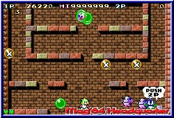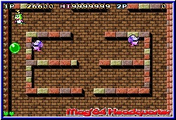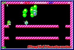Der Spieler schaut von vorn auf das Geschehen und kann per L-Taste den Bildschirm etwas auszoomen. Ihr steuert einen der kleinen Racker. Mit ihm ist es das Ziel in jeder Stage alle Gegner innerhalb eines Zeitlimits zu erledigen. Dazu stehen euch einzig die sogenannten Blasen zur Verfügung. Per A-Taste kann man die hintereinander schießen. Trifft man man damit einen umherwuselnden Gegner wird dieser in der Blase eingeschlossen. Jetzt springt man auf die Blase oder von unten heran und eliminiert den Gegner und bekommt dafür Punkte und Items. Diese Items in Form von Früchten wie Bananen oder Birnen werden in einer Item Gallery freigeschaltet. Mit der B-Taste könnt Ihr selber springen und so zum einen Ausweichen oder aber Etagen innerhalb des Screens überwinden. Ist unten ein Loch im Screen und fallt dort hinunter scrollt das Bild mit und Ihr fallt praktisch in der Stage nun oben wieder hinein. Verwirrt anfangs immer ein wenig, macht sich aber äußerst gut. Dabei muß sich der Charakter an bauliche Dinge halten, kann also nicht in jede Lücke seine Blasen schicken. Einfach rumstehen und warten ist also nicht. Problem ist auch das manche Gegner fliegen können, oder physikalisch korrekt gegen die Wand prallen um dann im gleichen Winkel zurück zu kommen. Das Spiel erfordert wie viele dieser Art sehr viel Aufmerksamkeit und Konzentration. Was mich stört ist die Tatsache das ein Treffer reicht um ein Leben zu verlieren. 3 Continues hat man die man zwar durch Score Grenzen auffrischen kann, aber zumindest 2 oder 3 kleine Herzen als Leben wären Perfekt. Denn ab einer bestimmten Grenze werden die Level richtig anspruchsvoll. Wobei es egal ist welche Version Ihr übrigens spielt. Normalerweise bieten solhe gebotenen Originale immer nur für kurze Zeit etwas. Hier ist dies nicht der Fall und man kann auch mit Original lange seinen Spaß haben. Sind alle Continues vorbei wird der Score wieder auf 0 gesetzt, könnt aber im letzten Level fortfahren. So kommt zwar Frust auf wenn man lange an einem Level sitzt, aber nicht deswegen weil man wieder komplett vorne anfangen muß. Wiegesagt grafisch ein Spiel das gelungen ist. In der neue Variante gibt es auch kleine Effekthascherei der Bläschen oder der farbenfrohen Grafik was Umgebungen und Frücht angeht. Auch die Level selber zeigen immer wieder andere Hintergründe und das ganze wird nie langweilig. Im Mulitplayer, egal welche Version spielt Ihr zwar zusammen, aber trotzdem was den Score angeht gegeneinander. Der Spielspaß stellt sich vor allem beim vorausschauenden Spielen ein. Gegner können ebenfalls aus dem Bild verschwinden um auf der anderen Seite wieder einzutauchen. Reaktionsvermögen und kluges Kombinieren macht den Reiz des Games aus, an dem man lange sitzt, durch das Speichern und der Levelwahl aber nicht gefrustet wird. Es revolutioniert nicht den Spielemarkt, dürfte aber Puzzle Fans gefallen. Wer am Klassiker Mario Bros. seinen Spaß hatte wird ihn hier auch haben. |