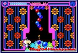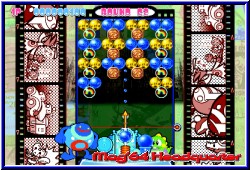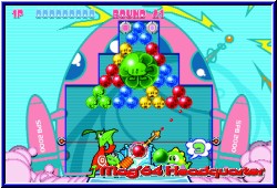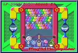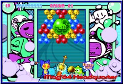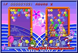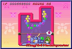 Mit dem Steuerkreuz stellt man die Richtung schnell und grob ein, so wie seinerzeit auf dem GBC. Mit den L und R-Tasten kann man nun feinjustieren, was fehlplatzierte Bläschen kaum zuläßt. Es sei denn die Hektik regiert. Die gibt's ja auch hier. Niedlich gemacht sind die kleinen Charaktere im Spiel. Eigentlich ohne so richtige Story gibt es kleine Charaktere, die unten an der Kanone stehen und dabei noch ein Rädchen drehen wenn Ihr die Richtung ändert. Viele kleine Animationen erfreuen das Auge. Kommen die Bläschen im Spielfeld der Grenze gefährlich nahe verschwinden sie auch aus Angst. Lustig gemacht. Die Itemfelder in Form der Blöcke oder Kugeln sind wie schon erwähnt zahlreiche als in den Vorgänger Versionen. Manche nehmen die Farbe an, wenn angrenzende Bläschen verschwinden. Dazu z.b. die Sternkugeln, die alle gleichfarbigen zerplatzen lassen wenn man diese z.b. mit einer roten trifft. Wichtig ist auch hier wieder eine gewisse Kombinationsgabe. Hängen an 2 gelben Bläschen einige einzelne andersfarbige Bläschen und man trifft mit einer 3. gelben die anderen beiden fallen auch wieder die angrenzenden mit herunter. Dumm wird's wenn partout nicht die Kugel kommt die man braucht und man sich regelrecht zubaut, was natürlich auch hier wieder geht. ;-) Dazu kommen Blocker innerhalb eines Spielbereiches die eure Bläschen im Feld abprallen lassen und somit die Flugbahn völlig verändern. Deswegen ist für Anfänger die Hilfslinie auch immens wichtig. Sie zeigt mit einer leicht transparenten Linie nicht nur an wohin Ihr zielt, sondern auch wie und wohin ein Bläschen abprallt wenn Ihr mit der Wand spielt. Was auch oft der Fall ist. Im Zentrum alles zugebaut muß man oft rechts oder links drumherum spielen um weiter zu kommen. Dazu kommt ein Block der es euch ermöglicht die Kanone anders zu platzieren. Am besten finde ich aber die Riesenkugeln. Sie sieht man meist schon zugebaut von anderen und besitzen ebenfalls eine Farbe. Trifft man sie mit einer gleichfarbigen gehen gleich alle gleichfarbigen mit kaputt, während die anderen die Farbe der großen annehmen. Was man wieder schnell lernt ist der Zeitfaktor. Nicht nur um das Level ansich zu beenden, sondern um einen Sonderbonus in Punkteform zu bekommen. Und wieder sind wir beim leidigen Score Thema. Hat man seine Zielgenauigkeit geübt kann man sich an die Modi machen. Natürlich laden hier die neuen Level als erstes ein. Wieder gilt eine Levelpyramide von unten nach oben durch durchqueren. Pro Level gilt es 5 Spiel Stages zu gewinnen um jeweils in der Pyramide nach oben zu kommen. Dabei kann man immer mehrere Wege gehen innerhalb der Pyramide. Unterschiede sind logischerweise die Levelbauten und der Schwierigkeitsgrad der extra nicht eingstellt wird. |