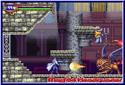 Das Hauptmenü gestaltet sich schlicht, Euch bleibt lediglich die Wahl zwischen dem "Spielstart" und dem "Seelentausch". In letzterem ist es Euch möglich, gefangene Seelen an einen Mitspieler weiterzugeben und im Gegenzug eine aus dessen Fundus zu erhalten. Auf das Thema "Seelen" werde ich im Laufe des Artikels jedoch noch näher eingehen, da es sich hierbei um ein neues, sehr interessantes Feature handelt, dass die Spell Books sowie die Sekundärwaffen der Vorgänger-Titel (Messer, Axt, Kreuz, Weihwasser, Bibel, Heilige Faust) überflüssig macht. Entscheidet Ihr Euch für ein neues Spiel, könnt Ihr im nächsten Menü einen von bis zu drei Spielständen wählen, jene kopieren sowie, bei Bedarf, im virtuellen Nirwana des GBA-Speichers verschwinden lassen (löschen! ;-) ). Wie für einen Castlevania-Teil typisch, steuert sich das Spielgeschehen ohne größere Probleme, mit dem "A"-Button springt Soma, ebenso wird durch zweimaliges Drücken ein Doppelsprung ausgeführt, der Euch an zuvor unerreichbare Stellen bringt. Die "L"-Schultertaste lässt Euer Alter Ego gewisse Fähigkeiten wie etwa den "hohen Sprung" (Hippygryph) durchführen, mit "R" ruft Eurer Protagonist eine Schutzseele herbei, die daraufhin einen magischen Effekt aktivieren. Mit "B" benutzt Ihr Eure Waffen, wobei die Peitsche als Standardwaffe außen vor bleibt. Dafür findet Ihr - wie schon im Vorgänger - eine Vielzahl verschiedenster Waffen (Ascalon, Kaladbolg, Balmung, Dreizack, Lanze) die zum Teil immens effektiv sind, da Eure Eigenschaften wie "Stärke", "Konstitution", "Intelligenz" oder aber "Glück" damit positiv sowie auch negativ verändert werden können. Neben den Waffen, findet man zunächst Körperbekleidungen in Form von Rüstungen (Stahlharnisch, Wasserrüstung) sowie Utensilien wie Schals, Ringe (Satans Ring, Runenring, Goldring) oder aber auch Anhänger sowie Glücksbringer. In diesem Zusammenhang brachte mich die Pistole zum Schmunzeln, die zwar nicht besonders schnell zum Ziel führt, jedoch aus der Distanz wirkt und völlig untypisch für einen Castlevania-Teil ist. Die große Anzahl an Gegenständen, die man während seines Abenteuers innerhalb des Schlosses findet, ist untereinander frei kombinierbar und kann bei Bedarf bei Hammer, dem Army-Mitglied, gewinnbringend verhökert werden. In "Harmony of Dissonance" war dies noch nicht möglich, ebenso hat sich die Anzahl der möglichen, mitzuführenden Gegenstände einer bestimmten Sorte drastisch verkleinert. Konnte man im Vorgänger noch sage und schreibe 99 Objekte "gleicher Bauart" (zum Beispiel Zaubertränke…) mit sich führen, sind nun nur noch maximal neun gleiche Gegenstände im Inventar von Soma Cruz vertreten. Insofern ist es Euch daher auch nicht mehr möglich, Euren Rucksack mit Heil-bringenden beziehungsweise fördernden Tränken in's Unendliche voll zu stopfen um etwa für Zwischengegner ausreichend gewappnet zu sein. |