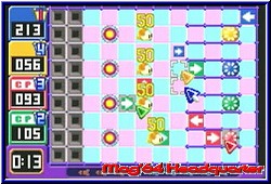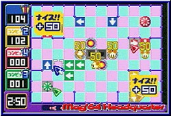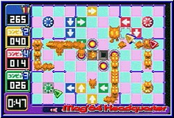 Teilweise muß man diese aber erst freispielen. Im Spiel geht es grob um den Kampf kleiner Weltraummäuse (ChuChus) gegen die bösen Space Cats (KapuKapus). Ihr sollt nun die ChuChus vor den Cats retten. Soweit so gut. Wählt man eine Stage an beginnen natürlich die ersten mit einem leichten Schwierigkeitsgrad zum warm werden. Grundlage ist ein 12x9 Felder großes Battlefield. Auf diesem befinden sich verschieden viele Mäuse. Zu Beginn passiert noch garnichts. Hier könnt Ihr euren Gehirnschmalz in Ruhe rotieren lassen ehe man die Action startet. Ziel ist es alle Mäuse in vorgesehene Raketen auf dem Spielfeld zu steuern. Dabei wird mit der L-Taste die Action gestartet und die Mäuse flitzen los. Das ganze ein wenig wie bei den Lemmingen. Die Mäuse rennen immer geradeaus und wechseln zum einen nur an Hindernissen wie Wänden und Blockern ihre Richtung. Zum anderen könnt Ihr die Richtung die sie nehmen durch kleine Pfeilsymbole beeinflussen. Diese Pfeilsymbole werden euch zu Beginn in einer bestimmten Anzahl und Richtung gestellt, die Ihr nicht verändern könnt. Mit einem Mauszeiger platziert Ihr also das Pfeilsymbol auf dem Spielfeld und laßt mit der L-Taste die Racker loslaufen. Je nachdem ob Ihr den Pfeil richtig platziert habt flitzen nun die kleinen Mäuse in die Rakete und heben ab und die Stage ist gelöst. Drückt man in der Bewegung der Mäuse nochmals R laufen sie doppelt so schnell, was man auch wieder Rückgängig machen kann. Merkt man das die Pfeilwahl Blödsinn war drückt man die L-Taste um wieder am Ausgangspunkt zu sein. Und das ist man oft. ;-) Denn je weiter man in der Stagereihenfolge vorrückt um so kniffliger werden die Spielfelder. Das beginnt zum einen mit Blockern, die mal einzeln auf dem Spielfeld vorhanden sind bis hin zu regelrechten Gebilden. Auf einer Stage bilden sie die Wortfolge DREAM Gba. Da muß man durch. Hier muß man vor dem Beginn die Laufrichtung der Mäuse im voraus berechnen. Man kann sie auch loslaufen lassen und schauen wo der Pfeil gesetzt werden sollte und gleich wieder abbrechen. Dazu kommt die Tatsache das es mit der Zeit auch mehrere Pfeilsymbole in alle Richtungen zur Verfügung stehen. Auch diese wollen und müssen platziert werden. Reicht das immer noch nicht wuseln in vielen Leveln die gefürchteten Space Cats herum. Diese dürfen zum einen den Laufweg der Mäuse nicht treffen und zum anderen auch nicht eine Rakete erreichen. Mit der Zeit muß man variieren und die Pfeilsymbole auch dazu einsetzen um die Cats umzuleiten, die immer einen festen Laufweg haben um sie an den Mäusen vorbeizuleiten. So kommt es vor das man teilweise den Wald vor lauter Bäumen nicht sieht. Man zerbricht sich den Kopf wie man die Pfeile für die Mäuse setzt um später festzustellen das man die Cats weglotsen sollte. |