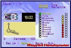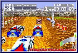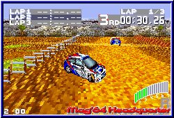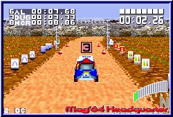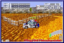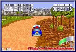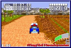 Danach gelangt man zur ersten von 6 Rally's. Quer durch Europa, Afrika und Australien führt euch nun die Rennaction. Dabei stehen pro Location je nach gewähltem Schwierigkeitsgrad 3-6 Einzelprüfungen auf dem Programm, die wie immer im Rally Sport von einem Punkt A nach Punkt B gefahren werden. Neben dem Arcade Mode kommt man so auf knapp 40 Strecken im gesamten Spiel. Auch wieder ohne Gegner, sondern nur gegen die Zeit der Mitkonkurrenten. Ihr bekommt erstmal mehrere Bildschirme vorgesetzt. Das beginnt bei der Erklärung der Strecken Charakteristik, dem Wetter, dem Untergrund und den Lichtverhältnissen. Aus diesen Informationen dürft Ihr euch nun das Setup des Wagens zusammenstellen. Hier muß ich sagen wirken sich Änderungen wesentlich besser aus als bei V-Rally. War dort die Wahl des Reifens entscheidend ändert sich das Fahrverhalten hier bei allen Punkten. Immerhin 7 Einstellungen von der Reifenwahl, über die Übersetzung des Getriebes, der Bremsbalance bis hin zum Lenkeinschlag sind möglich. Der dritte Bildschirm betrifft die Werkstatt, welche je nach Fahrweise nach einem Rennen besucht wird und euch die Reperatur beschädigter Teile des Wagens erlaubt. Auch hier alles nach Regeln. 60 Minuten stehen euch zur Verfügung. Alle beschädigten Teile kosten Zeit. Je stärker die Beschädigung um so länger die Reperatur. Fahrt Ihr also zu sehr auf Teufel komm raus kann es auch sein das die 60 Minuten nicht ausreichen und Ihr einen Teil beschädigt lassen müßt. Die letzten Bildschirme umfassen das Speichern auf einen der beiden Speicherplätze und der Spielstart. Hier fällt das Spiel gegenüber V-Rally grafisch sichtbar ab und ist eher im GT Advance 2 vergleichbar. Doch recht pixelig wirken Auto und Umgebung. Trotzdem sind Details wie einzeln drehende Räder erkennbar, was für ein gutes Fahrzeug Modell spricht. In einer hinter dem Fahrzeug Sicht müßt Ihr nun versuchen gegen 15 andere Fahrer imaginär die Bestzeit zu fahren. Dabei existieren reichlich Checkpoints über die Strecke verteilt, die euch sofort den Abstand zum aktuellen Vorder oder Hintermann anzeigen. Zählt die Startuhr nach unten darf gesteuert werden. Lob gibt es für die Steuerung, oder besser gesagt für das Lenksetup. Durch die Einstellung von Neutral über Niedrig bis zu sehr Hoch was den Lenkeinschlag angeht könnt Ihr entweder mit einer extrem verzögernden Lenkung fahren oder eine sehr direkten. Gleich ist bei allen ein sehr gelungenes Drift Verhalten des Wagens, das beim Übertreiben in einem Dreher endet. Dazu trägt auch der Untergrund bei und das Setup des Wagens. Dem zugute kommt die fehlende automatische Null Stellung der Lenkung. Lenkt man nach links und läßt das Kreuz los bleibt der Lenkeinschlag. Gibt mehr Kontrolle und bessere Drifts. |
