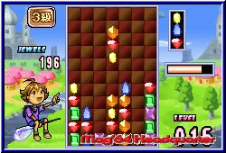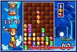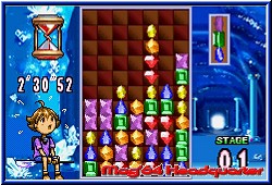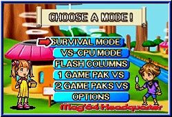 Und wieder gibt es eine Premiere zu feiern auf dem deutschen GBA. Für einen kurzen Moment nach dem Einschalten fühlt man sich an den Game Gear erinnert. Das fette Sega Logo erscheint auf dem GBA Screen. Nach dem GameCube also nun auch Nintendo's Kleiner. Neben Chu Chu Rocket das zweite Spiel von Sega das bei uns erschienen ist. Columns ist im Hause Sega kein unbekannter und vergleichbar mit Bust A Move und Tetris was das grobe Spielprinzip angeht. Desweiteren wie Chu Chu Rocket auch erfreut Sega seine Fans mit der Tatsache für Multiplayerfreuden nur ein Spielmodul zu benötigen. Hier können 2 Spieler so gegeneinander antreten. Nach dem Einschalten wird dem Spieler die hier vorhandene Story in Form eines nett gemachten Vorspanns gezeigt. Hintergrund ist die bevorstehende Ernennung der Prinzesson Dazzle zur Königin. Natürlich wie es sich gehört soll sie auch eine Krone bekommen - die Columns Krone. Wäre da nicht ein großes Problem. Auf der Krone sitzen normalerweise 24 Edelsteine. Kurz vor der Krönung sind aber nur 4 davon noch vorhanden. Also Grund genug die fehlenden wiederzubringen. Aus diesem Grund beauftragt Dazzle 2 Freunde, Jade und Ruby mit der Suche nach den Kristallen, die im Spiel in den verschiedenen Spielmodi erspielt werden müssen. Was auch dauerhaft so bleibt. Diese Namen wie erreichte Dinge im Spiel werden im Spiel auf einer, ja Ihr ahnt richtig - Batterie festgehalten. Es gibt also doch noch Spiele dieser Art die eine Batterie mitbringen. Später wird alles automatisch gespeichert ohne das Ihr etwas dazu tun müßt. Vor dem eigentlichen Spielstart gibt man beiden entweder diese Namen oder kann einen eigenen Namen für jeden verwenden. Im Hauptmenu sind die Punkte Survival, VS und Flash Columns für einen Spieler, sowie jeweils einen Menu Punkt für die 1 Cartridge Mulitplayer Variante und für 2 Cartridges vorhanden. Als letztes könnt Ihr in den Optionen die Highscores anschauen, die Batterie auch wieder leeren oder erspielte Kristalle mit einem Freund über das Linkkabel tauschen. Der Survival Modus dient zum einen dem Kennenlernen des Spielprinzips und ähnelt am meisten seinen Konkurrenten. Vor dem Spiel wählt man nun wie in allen anderen Modis auch die Spielfugur aus den beiden aus und das Spiel beginnt. Vor euch taucht nun der Spielbildschirm auf. Ein animierter Hintergrund, sowie das Spielfeld. In diesem Spielfeld fallen nun verschiedene Objekte nach unten. Diese bestehen immer aus 3 aneinanderhängenden Kristallen. Mit der A und B Taste könnt Ihr die Reihenfolge mischen. Das geht auch in 1er Stufen. Das heißt wenn Ihr oben einen blauen Kristall habt, in der Mitte einen gelben und am Ende einen roten könnt Ihr auch den roten oder blauen in die Mitte bekommen. Mit A und B jeweils vorwärts oder rückwärts.