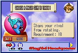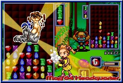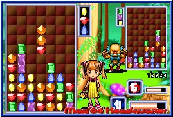 Größter Unterschied zu Tetris ist das einzig diese 3er Gebilde erscheinen was die Kristalle angeht. Seitliche Bauten und einzelne Kristalle gibt es nicht. Ziel ist es diese unterhalb so aufzutürmen das sich mindestens 3 gleiche treffen. Das geht über gerade Linien, als auch über diagonale. Ist so eine Linie komplett verschwinden sie und die restlichen rutschen nach. Klar das so eine Aktion sofort entweder Kettenreaktionen auslöst oder ein Stirnrunzeln in das Gesicht des Spielers treibt, da seine geplanten Anordnungen nun völlig durcheinander geraten. Um im Spiel voran zu kommen und Edelsteine zu bekommen müßt Ihr zum einen eine bestimmte Anzahl an Reihen geleert haben, sowie innerhalb eines Rangsystems aufsteigen. Dabei unterscheiden sich in allen Modi die Zeitpunkte wann Ihr mit welchem Spieler einen der seltenen Edelsteine bekommt. Die Schwierigkeit liegt hier wie bei Konkurrenz im schneller werden der Fallbewegungen und damit verbundenen Hektik die natürlich aufkommt. Daneben gibt es in diesem Modus sogenannte Black Magic Gems. Rechts neben dem Spielbildschirm ist dazu eine Leiste, die sich mit jeder abgebauten Reihe ein Stück füllt. Ist dies voll erscheinen die Black Gems und alle Linien innerhalb des Spielfeldes, die unvollendet sind verschwinden, was auch mir oftmals den Hals gerettet hat. Eines muß man über Columns Crown sagen. Es ist schwerer als die Konkurrenz. Einzig Mr. Driller 2 ist ähnlich knackig. Der Modus Flash Columns basiert auf demselben Spielprinzip gibt euch aber nun Aufgaben in aufeinanderfolgenden Levels. In jedem gilt es einen farbigen Kristall am Boden des Spielfeldes zu entfernen in dem man 2 gleichfarbige mit diesem zu einer normalen Linie verbindet. Dazu müssen die drumherum liegenden aber erstmal entfernt werden, was oftmals im Gegenteil endet und man sich mörderlich zubaut. Positiv ist das man unendlich Continues besitzt, sollte man ein Level nicht schaffen. Schafft Ihr 5 Level am Stück könnt Ihr diese beim nächsten Start auch überspringen. Reichen diese Modi allein schon aus den Spieler wahnsinnig im positiven zu machen setzt der VS Modus noch einen drauf. Hier gilt es die Diebe des Waldes in einem 1 gegen 1 Kampf zu schlagen. Hier kommen zunächst Überraschungsitems dazu. Davon könnt Ihr vor dem Spielbeginn 5 auswählen, die in den einzelnen Matches erscheinen. Jedes Item bewirkt beim Gegner etwas anderes. Nach einer bestimmten Anzahl von Reihen tauchen sie im Spielfeld als einzelne Kugeln auf die einen Buchstaben tragen. Sind sie aktivert lassen sie Kristalle beim Gegner unsichtbar werden, sein Spielfeld nach einem Erdbeben wackeln oder abrupt nach unten fallen für eine gewisse Zeit. |