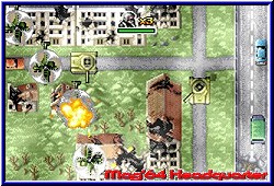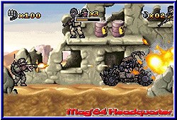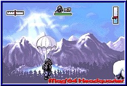 Der Held kann neben laufen auch springen, sich ducken und verfügt darüber hinaus über spezielle Fähigkeiten, die man per Menu anwählen kann. Neben der Lebensenergie und der Leben Anzeige ist oben links im Screen dieses Menu. Hier schaltet Ihr per L-Taste durch eure Waffen und Ausrüstungen. Das jeweils angewählte wird per B-Taste aktiviert. Beim schießen könnt Ihr nach oben wie auch nach unten ballern, was durch viele Ebenen und Plattformen nicht unwichtig ist. Die Steuerung ist sehr gut und gibt keinen Grund zur Klage. Angenehm weiches springen, das den Spieler nie im Stich läßt. Rechts oben im Screen ist die Anzeige für die Handgranaten, die per R-Taste geworfen werden. Cooler Klang, die recht real klingt. Damit kann man vor allem verschanzte Gegner erwischen die vor euch in Deckung gegangen sind. Taktisches Vorgehen ist oftmals sehr ratsam. Wiegesagt. Durchrennen und alles nieder mähen was euch in den Weg kommt kann man schnell vergessen. Aufgelockert wird das ganze durch Zusatz Feature. Zunächst Fallschirm Springen bei dem Ihr verschiedene Anzeigen im Screen austangieren müßt und im richtigen Moment die Reißleine ziehen. Oder der Sniper Modus, der sehr an Perfect Dark auf dem GBC erinnert. Nur einen Sniper Ausschnitt vorhanden müßt Ihr innerhalb einer bestimmten Zeitspanne eine Anzahl an Gegnern erwischen, die gerade Geiseln genommen haben. In der nächsten Welt kommen dann der Raktenwerfer dazu wie auch eigene Zeitminen, mit denen Ihr gefährliche Stellen mit einem Schlag klären könnt. Wer in der "guten alten Zeit" Spiele wie Axelay & Co gerne gespielt hat kommt hier ebenfalls auf seine Kosten. Ihr steuert dann einen Heli und müßt im Screen nach oben fliegen und dabei Panzer und andere Gegner erledigen und dabei Ausweichen und Treffer vermeiden. Wie in allen Varianten ist der Schwierigkeitsgrad recht hoch. Auch weil meist Gegner aus verschiedenen Richtungen mit einmal angreifen. Sie legen Minen, zerstören aus der Ferne Tonnen, die neben euch stehen oder lassen ihre Raketenwerfer sprechen, obwohl Ihr sie noch garnicht seht. Nicht unfair, aber sehr anspruchsvoll. Was aber leider auch durch gewisse Dinge erschwert wird. Mit 5 Leben fängt man an. Verliert man eins spielt man sofort an derselben Stelle weiter. 5 Leben klingt viel, ist aber garnichts. Wie oft ich mit 4 Leben beim Boss ankam um dann draufzugehen und alles nochmal spielen zu müssen will ich lieber nicht erzählen. Hier wäre eine Paßwort Vergabe nach jedem Teillevel positiv gewesen und nicht erst nach jeder Welt. Dadurch macht man das schwere Game noch etwas kniffliger. Jedes Leben zählt. Grafisch und vom Sound her ein wirklich gelungenes Spiel. Viele kleine Effekte, schöne Umgebungen und verspielte Animationen erfreuen das Auge. Dazu dynamische Musik, die der Spielsituation angepaßt ist. Man könnte auch sagen Advance Wars von der Action Seite aus. Wer mal wieder mehr als 10 Stunden an einem 2D Shooter der alten Garde Interesse hat muß zugreifen. Ein in dieser Form echt seltenes Spiel das mich perönlich überzeugt hat.