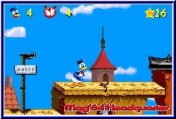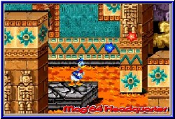 Momentan sind bei Ubi Soft mal wieder die Software Schleusen weit offen. Aber warum auch nicht. Weihnachten steht vor der Tür. Unter den vielen erscheinenden Titel ist auch ein weiterer alter Bekannter vom GBC. Donald Duck, der auf so ziemlich allen Plattformen die gute Daisy retten durfte ist nun auch auf dem GBA gelandet. Die GBC Version empfand ich seinerzeit als recht gelungen und vor allem anspruchsvoll. Wollen sehen wie sich die GBA Version schlägt. Zunächst darf der Spieler aus mehreren Sprachen wählen, wobei auch deutsch dabei ist. Danach zeigt uns endlich mal wieder ein Spiel das Silent Hill keine Eintagsfliege war was FMV Sequenzen angeht. Wenn auch leider nur ein paar Sekunden lang darf der Spieler ein tolles Intro bestaunen in dem die Story teilweise gezeigt wird. Hier gibt's ein wenig Kritik. Auch wenn die Story nicht das wichtigste ist, aber auch hier ist es dieselbe wie auf den anderen Plattformen. Die Reporterin Daisy hat es geschafft den mysteriösen Tempel des Schurken Merlock zu finden und beginnt gerade ihren Live Bericht, als die Verbindung jäh abbricht und man sich im Entenhausener Fernsehstudio Gedanken macht was mit Daisy passiert ist. Dein Auftritt Donald! Wie es sich für einen richtigen Gefährten gehört legt unser Held Donald sofort los und will seine Daisy finden. Allerdings benötigt der die Hilfe Daniel Düsentriebs. Nur eine bestimmte Teleporter Maschine macht den Kampf gegen Merlock möglich. Leider fehlen dazu jede Menge Energiekugeln. Also muß Donald erst diese finden um am Ende den Teleporter nutzen zu können. Soweit zur Story. Das Hauptmenu bietet viele Punkte. Neben dem reinen Spielstart das Paßwort Menu, die Options für den Sound, sowie die Credits und eine Galerie mit 16 abgedeckten Bildern, die erst durch intensives Spielen freigeschaltet werden. Wählt der Spieler den Spielstart so liegen vor dem Spieler 4 Welten a 4 Stages, wobei auch grafisch die Themen und Umgebungen 1:1 mit der GBC Version übereinstimmen. Natürlich grafisch ein aufgepeppt. Alle Level muß der Spieler dabei hintereinander spielen. Kann aber später jedes bereits gespielte so oft betreten wie er möchte. Am Ende jedes Levels bekommt man ein Paßwort mit dem man später sein Spiel wieder fortsetzen kann. Bevor Merlock aber in seinem Tempel herausgefordert werden kann stehen Donald genug andere Aufgaben bevor. Beginnt ein Level steuert Ihr Donald mit dem Kreuz durch eine 2D Welt. Dabei ist sie nach allen Richtungen offen und viele Etagen müssen überwunden werden. Auch spielerisch hält man sich exakt an alte Gewohnheiten. Ziel in jedem Level ist es 3 der Energie Kugeln einzusammeln. Findet man die dritte wird der finale Teleporter aktiv durch den der Spieler das Level verläßt. Für die Kugeln besitzt Ihr Anzeigen.
