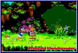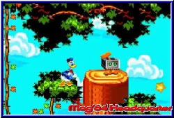 Um die Kugeln einzusammeln müßt Ihr zunächst ein Zauberbuch finden, das es zu jeder Kugel gibt. Dieses liegt immer ein Stück entfernt. Aktiviert man es bekommt man eine Sekundenanzeige im Screen, wie lange man Zeit hat die Kugel zu holen. Liegt diese am Anfang noch um die Ecke, darf in den hinteren Welten, vor allem in Gundels Welt und Merlocks Tempel ein wenig mehr an Terrain zurückgelegt werden. Postitiv das wenn man das Buch aktiviert eine Kamera die Kugel und ihren Fundort zeigt. Weitere Anzeigen im Screen ist die Lebenanzahl, sowie die Sternanzeige. Eine Energieanzeige gibt es wieder nicht. Etwas das mir an allen Versionen nicht gefallen hat. Donald kann gerade mal 2 Treffer kassieren ehe er draufgeht. Wieder gibt es seine sogenannten Stimmungen. Wird er einmal getroffen geht er seine Mütze nach vorne schiebend durch das Level. Sieht amüsant aus. Die Animationen Donalds sind gut gelungen. Dazu kleine original Sprachsamples die das ganze aufklockern. Vor allem wenn man Donald mal eine Weile stehen läßt. Die Sterne sind sehr wichtig. Sie gibt es in 3 Versionen und Wertigkeiten und ergeben bei 100 gefundenen ein neues Leben. Den Kritikpunkt des zweimal treffens hat man durch verschiedene Feature etwas entschärft. Zum einem kann sich Donald natürlich wehren, was man mit der B-Taste bewerkstelligt. Daneben sind die Sterne in recht hoher Anzahl vorhanden. Teilweise bin ich mit über 30 Leben durch die Level gelaufen. Was auch einiges über den Schwierigkeitsgrad aussagt. Die GBA Version ist um einiges leichter als die GBC Version. Das Spiel ist dabei nicht unbedingt linearer als der Vorgänger, bietet aber z.b. relativ viele Rücksetzpunkte in den Leveln. Zusammen mit den vielen Sternen stellt es den Spieler vor keine unlösbaren Aufgaben. Die Gegner im Spiel sind genau richtig. Was Anzahl und verschiedene Arten angeht. In jeder Welt andere sorgen sie schon für den einen oder anderen Schreckmoment. Aber genauso wie die Gegner findet man ebenfalls oft Items die Donalds Stimmung wieder herrichten. Nicht so das man über sie stolpert, aber dennoch ausreichend. Deswegen ist die GBA Version in meinen Augen genau das richtige Spiel für die jüngere Klientel die gerne mal ein Jump'n Run spielen. Für die ist das Spiel genau richtig. Schwer genug um trotzdem lange zu begeistern, aber mit einem ausgewogenen Schwierigkeitsgrad der den meist ungeduldigen jüngeren Spielern den Spaß nicht verdirbt. Freunde des 100% Lösens eines Spiels werden mit dem Sterne sammeln aber auch noch anders bedient. Denn nur wenn man komplett alle einsammelt, und das können über 200 pro Level sein wird im Paßwort Bildschirm eines der 16 Fotos freigeschaltet. Von der Warte her ist ein Anspruch da. Denn ich persönlich habe nicht ein Foto. |
