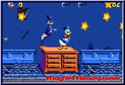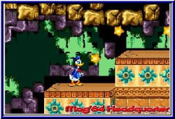 Denn um wirklich alle Sterne zu finden muß man die Level bis in's letzte durchsuchen. Geht man nach dem reinen Spielziel des durchspielens werden erfahrene Spieler keine großen Probleme haben. Grafisch ist auch die GBA Version ein gelungenes Spiel. An die Pracht eines Rayman oder Wario kommt er aber nicht ran. Muß er aber auch nicht. Was geboten wird ist mit viel Liebe zum Detail gemacht und bietet viele Details fürs Auge. Dazu ein unterhaltsamer Sound der zum Spiel paßt. Donalds mißmutige Geräusche inbegriffen. Die Steuerung selber ist ebenfalls sehr gut und gibt dem Spieler die volle Kontrolle über den Charakter. Dazu kommt wieder der obligatorische Doppelsprung, den Donald Spieler ebenfalls schon kennen. Neu ist dagegen der Sprint mit der R-Taste. Damit kann und muß Donald weite Entfernungen überwinden und in Spezialleveln bestehen. Denn Endgegner Kampfe in dem Sinne gibt es nicht. Einzig Merlock läd zum Clinch ein. Abwechslung bieten da die jeweils 3. Stages jeder Welt. Hier scrollt das Bild automatisch und der Spieler muß rennen und alles mögliche überwinden. Denn hier wird er verfolgt und darf keinen Moment verharren. Auch hier hat man Rücksetzpunkte eingebaut, so das auch dies kein Problem ist. Einzig in Gundels Welt wird das ganze durch Etagenwechsel etwa kniffliger. Ansonsten wird normale Jump'n Run Kost geboten. Bewegliche Plattformen, Lianen zum klettern oder Hindernisse und Gegner, die ein vorankommen erschweren. Aber wie ich schon erwähnte mehr für das jüngere Publikum. Zwar ist Merlocks Tempel durchaus nicht einfach, wird aber durch angesprochene Rücksetzpunkte, Sterne und Items auch kein Problem für erfahrene Spieler sein. Ein technisch und spielerisch gelungenes Spiel, das aber wenig neues mitbringt und bekannte Größen nicht gefährdet. Wer aber für seinen Sprößling eine Disney Freude zum Fest sucht liegt mit dem Spiel genau richtig. Das einfache Spielprinzip und die ausgewogene Steuerung sind dafür ideal. Ältere Semester greifen zu Wario, Rayman oder Mario Advance.