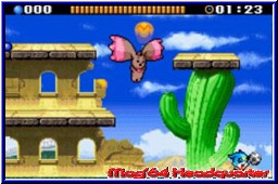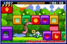 Wichtigster Button ist der B-Knopf. Mit ihm wird die normale Attacke ausgeführt. Jedes Digimon hat eine eigene Attacke und Ihr solltet nun den Gegner versuchen zu treffen. Bei einem solchen Treffer verliert das gegnerische Digimon einen der D-Spirit Balls, den Ihr nun tunlichst einsammeln solltet. Darüber hinaus gibt es weitere Möglichkeiten den Gegner eins auszuzwischen. Einen Tempoangriff bei doppeltem Richtungsdrücken oder reichlich kleine Items innerhalb der Areale. Immer wieder tauchen unbeteiligte Digimons auf, die Ihr erledigen könnt und dafür ein Item erhaltet. So könnt Ihr den Gegner bewegungsunfähig machen, von einer Plattform schubsen oder verlangsamen. Der Mega Move ist dann möglich wenn das Digimon Calumon in der Arena auftaucht. Es schwebt und nach einer Berührung mit ihm wird euer Digimon zum Kampfkoloss. Größer, mächtiger und vor allem sehr effektiv. Jetzt wird die Leiste am oberen Bildschirmrand wichtig, welche die Zeit anzeigt in der Ihr diese Special Attacken ausführen könnt. Hier könnt Ihr dem Gegner mit einem Treffer gleich 4 oder 5 Bälle wegnehmen. Natürlich versucht auch der Gegner all diese Dinge und das Spiel ist mehr ein Hin und Her durch die Arena. Über Plattformen nach oben das ein wenig an die Mario Bros. Spiele erinnert. Dabei schauen wo der Gegner ist und versuchen ihn zu attackieren. Durch die kleinen Charaktere wirkt das ganze aber recht eintönig und wenig spektakulär und verliert sehr schnell seinen spielerischen Reiz. Die Variationen erscheinen auf den ersten Blick recht groß, mit der Zeit spielt man seinen Stiefel aber einfach nur herunter ohne groß zu variieren. Dafür sind die Kämpfe für einen älteren Gamer zu leicht und man kommt doch recht fix durch das Spiel. Es gilt insgesamt 7 dieser Kämpfe zu gewinnen. Hintereinander, ohne die Möglichkeit zu speichern gilt es im letzten Kampf einen Endboss zu besiegen, der dann schon wieder knackiger ist. Hier müßt Ihr seine Energieleiste leeren, bevor er euch 7 D-Spirit Balls klaut und Ihr verliert. Positiv das man zumindest unendlich Continues besitzt um einen verlorenen Kampf sofort wiederholen zu können. Danach folgt der Abspann und man kann erneut beginnen. Zwar weist das Handbuch darauf hin mehrmals und mit verschiedenen Digimon das Spiel zu zocken, allerdings hält sich der Wiederspieldrang in Grenzen. Ich tue mich immer schwer mit Spielen, die an sich recht kurz sind. Für die breite Masse ist das Game sicher nichts. Fans der Digimon bekommen ihre Helden mal etwas anders zu Gesicht. Aber in dieser Hinsicht gibt es spielerisch ganz andere Kaliber, die vor allem länger begeistern können. Zwar eine kunterbunte und verspielte Grafik, gepaart mit einem passenden Sound kann das Spiel auf lange Sicht nicht überzeugen. |