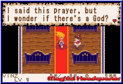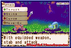 Im Laufe der Zeit und der Siege verbessern sich die Eigenschaften von Schild und Waffe, was deren Schlagkraft sehr entgegenkommt. Auch lernen wir einige neue Skills dazu, die wir dann selbst einer Position (Stein, Schere, Papier) zuordnen können. In allen Locations außerhalb Popongas finden wir kleine Säckchen mit brauchbaren Items, die per Roulette ausgespielt werden. Das können Healer, Gegengifte, Fallen oder ähnliches sein. Also auch eine reine Glücksache, was man einsacken kann. Die Schatztruhen unterwegs enthalten auch diverse Sachen, die aber nicht ausnahmslos gut für uns sind. Denn wenn man hier das Roulette falsch stoppt, kann man vergiftet, umnachtet, eingeschläfert werden oder man verliert alle erspielten Münzen u.s.w. Genauso Glücksverbunden verhält es sich mit den Waffen und Schildsymbolen unterwegs, die uns neue Waffen verschaffen können. Anhand der Angriffswerte kann man erkennen, ob uns diese neue Waffe nützlich ist oder nicht. Im Laufe des Spiels kann man 100 Waffen und 50 Schilde finden oder konstruieren lassen. Neben „normalen“ Waffen, wie dem Schwert, dem Breitschwert, dem Dolch oder Beil kann man auch „abnorme“ Waffen einsetzen. So ist ein Fass recht effektiv oder auch die Wasserpistole, der Scherzartikel oder das Ü Ei. Unterwegs kann man max. 30 Dinge mitschleppen. Ist der Rucksack voll, muß man weitere Dinge zurück lassen oder mit dem Item „Lager es“ nach Hause transferieren. Da man nach jedem gewonnenen Kampf neben den Erfahrungspunkten auch Kohle einsackt, hat man relativ schnell 2000 - 8000 Münzen im Beutel. Verliert man einen Kampf, erwacht man in der Kirche von Poponga und hat alles verloren, was man sich mühsam erkämpft hat. Auch kann man die Location nur nach erfolgreichen Abschluß gegen den Endgegner dieser Stage verlassen. Deswegen ist es sinnvoll, ab und zu mal mit dem Item „Nach Hause“ den Rückmarsch anzutreten und seine Münzen ins Sparschwein zu stecken, Items und Waffen in der Kiste zu verstauen. Wenn man verschiedene Waffen und Schilde gefunden hat und dabei auch noch Geld übrig hat, der kann zum Schmied gehen und sich eine neue Waffe konstruieren lassen. Doch ein billiges Unterfangen ist das nicht. Wenn man in dem Item- und Waffenladen vorbeischaut, kann man sich dort auch neue Ausrüstung verschaffen. Sieht es mit der Kohle etwas eng aus, hat man auch noch die Option etwas zu verkaufen oder den Laden zu überfallen und somit einen Gegenstand ohne Bezahlung abzustauben. Dazu muß man nur den Kampf gewinnen. Verliert man, wird man polizeilich gesucht und ist ständig auf der Flucht. |