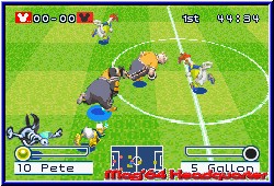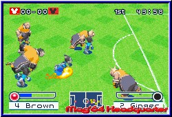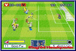 Im Dream Cup muß man seine Truppe in drei unterschiedlich schweren Turnieren zum Sieg treiben. Das es das schwerste Turnier in sich hat, kann ich an dieser Stelle nur bestätigen. Im Challenge Cup spielt man sich mit seiner Mannschaft die Levelleiter hoch und verdient sich jedesmal ein neues Item in seine Liste. Diese Items können unter Umständen das Spiel alleine entscheiden. So kann man mit dem sicheren Schuß, den Ball in der Luft noch steuern und ihn ins Netz befördern. Die Flitzer Füße bringen, wie der Name schon sagt, einen enormen Geschwindigkeitsschub. Das Item Schutzeffekt dagegen hindert seinen Gegner daran, seinen eigenen Zauber einzusetzen. Beim Spiel kann man unten im Bild die leiste seines (und des gegnerischen) Zaubers sehen. Diese füllt sich langsam beim spielen und kann, wenn die entsprechende Farbe erreicht ist, per L Taste eingesetzt werden. Auf dem Feldradar, sehen wir die Positionen der Mit- und Gegenspieler. Dafür hat man aber in der Regel keinen Blick. Denn Disney Sportīs Soccer ist schnell. Wie es sich für ein Arcadespiel gehört. Es gibt keinen Preis fürs Schönspielen oder 100% Passgenauigkeit. Es zählen nun mal nur die Tore. Und davon fallen reichlich. Da die Torhüter fast ausschließlich Fliegenfänger sind, muß man den Gegner schon im Vorfeld vom Ball trennen. Das kann man entweder mit fairen Mitteln erledigen oder man grätscht rabiat von hinten in die Beine. Das hat zwar ein Freistoß oder gar Elfmeter zur Folge, doch die unmittelbare Torgefahr ist bereinigt. Die Elfmeter sind nämlich auch haltbar bzw. die Schützen nicht sehr sicher. Da kann man auch schon mal einen Ball verbeischießen. Technisch ist auch eine Reihe Tricks möglich. Da kann man zum Bsp. eine Flanke per Flugkopfball versenken oder eine Direktabnahme riskieren. Oder man jongliert sich den Ball selbst in die Luft und nickt dann per Kopf über den Torwart. Die Spielaufstellung läßt eine Menge Zauber zu, denn bei 5 Mann auf dem kleinen Feld und einer Aufstellung von 1-2-1 ist genügend Platz vorhanden. Grafisch ist das Game richtig gut gelungen. Nicht nur die Darstellung der Spieler sondern auch die kleinen Jubeleinlagen der Spieler. Wenn Donald seinen Diver ansetzt oder Goofy einen Flick-Flack macht, sieht schon toll aus. Das einzige, was man bemängeln muß, ist die Steuerung beim Torschuß. Wie man es gewöhnt ist, drückt man beim schießen das Steuerkreuz Richtung Tor und läßt den Finger auf dem A Button für die nötige Power. Dann fliegt aber der Ball noch oben übers Tor. Wenn man Glück hat, senkt sich dieser noch ins Tor, aber meistens sieht es schlecht aus. Natürlich kann man sich die Steuerung angewöhnen, doch man macht den Fehler immer wieder. Doch alles in allem ist Disney Sportīs Soccer ein gutes Arcade Spiel, was die Zeit im Fluge vergehen läßt. Viel Tempo und viel Action und viele erspielbare Items bieten die ganze Palette Fußballspaß. Und das für die ganze Familie. |