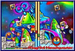Im Endeffekt geht es also darum wer als erster oben am Ballon ankommt. Um dies zu schaffen unterstützen und helfen euch verschiedene Items, die wie die Objekte herunterfallen. Wie die Kelle, die euch Lücken zuspachtelt ist z.b. der Hammer und die Bombe vertreten die Ihr dem Gegner in seinen Screen werfen könnt. Ebenfalls ein typisches Eggo Feature, das man immer gegen einen Gegner antritt der Live mit und gegen euch auf dem gleichen Screen spielt. Was mir besonders gefallen hat ist hier die technische Umsetzung. Weder erlebt der Spieler Speed Verluste oder gar Ruckler. Obwohl auf 2 Screens hier gleichzeitig teilweise erheblich viel los ist kommt die Engine nie aus dem Trott. Auch die Übersicht leidet auf dem GBA Screen keineswegs. Hat man sich so eingestimmt und eingewöhnt was die Steuerung angeht kann man sich an die Spielmodis wagen. Hier stellt man zunächst den gewählten Schwierigkeitsgrad ein. Neben Weichei ist wie auf dem Cube auch hier Steinhart vorhanden. Danach kommt eines der Highlights im Spiel. Ihr könnt das Hauptspiel nämlich auch zu zweit über ein Linkkabel spielen. Dabei reicht ein GBA Spiel aus. Einzig ein Charakter anwählbar ist dies aber keine Einschränkung. Spielt Ihr allein könnt Ihr aus 8 verschiedenen Eggo's wählen. Allerdings entscheidet mehr der persönliche Geschmack. Unterschiede oder gar Vor- und Nachteile haben die einzelnen Charaktere nicht. Je nach Schwierigkeitsgrad warten jetzt 8 oder 10 Gegner auf euch, die hintereinander gespielt werden müssen. Immer mit dem Hauptziel als erstes den Ballon zu erreichen. Leider kann man auch hier nicht zwischendurch speichern. Wenn man spielen möchte muß man dies an einem Stück tun. Auf Weichei kein Problem, da dieser Grad äußerst leicht ist. Auf Steinhart dagegen ist es gleich wieder eine Spur zu schwer. Ein Mittelweg wäre noch wünschenswert gewesen. Man beginnt ohne jegliche Continues, bekommt aber nach jedem Sieg eines davon. Da die Gegner mit der Zeit auch schwerer werden natürlich von Vorteil. Auf Steinhart erlebt man teilweise äußerst knappe Spiele gegen den Computerspieler, so das man voll bei der Sache sein sollte. Was hier auch daran liegt das je weiter man vorrückt die Schwierigkeiten zunehmen. Zum einen fallen mehr "böse" Items nach unten um den Gegner zu ärgern, als auch herumfliegende Gegner tauchen auf die euch einen geschnappten Stein klauen oder euch auch mal nach unten an das Ende eurer Bauten in's Wasser werfen. Durch die technisch sehr gute Umsetzung macht das Spiel Spaß wie auf dem GCN und Puzzle Freunde können sich ausgiebig austoben. Hier ist aber das fehlende Speicherfeature gerade auf Steinhart ein echtes Ärgernis. Wer dem Druck des Hauptspiels entfliehen will darf sich in den Extra Modis vergnügen. |