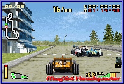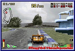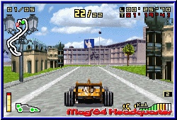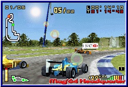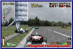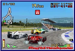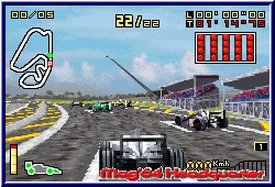 Ihr könnt einstellen ob Ihr den Stopp früh im Rennen, in der Mitte oder gegen Ende einschieben wollt. Darauf aufbauend kann man die Spritmenge anpassen die mitgenommen werden soll. In Sachen Setup gibt es leider recht wenige Dinge. Neben der Reifenwahl der Anpreßdruck, die Getriebe Übersetzung und die Bremsen. Alles in 3 Stufen fehlt mir hier ein wenig der Tiefgang im Setup. Dazu kommen die Einstellungen ob Ihr manuell oder automatisch schalten wollt und ob Km/h oder Meilen/h die Geschwindigkeit anzeigt. Danach kann man im Qualifying seine ersten Runden drehen. Das Spiel bietet einen Viewpoint und überrascht den Spieler mit einer sehr schönen Grafik und vor allem großen Fahrzeugen im Screen. Das gefällt mir äußerst gut. Dabei fällt auf das innerhalb eines Rennens 10 und mehr Fahrzeuge im Bildschirm auftauchen ohne das die Engine aus dem Tritt kommt. Dazu kommt ein äußerst hoher GameSpeed. An Steuermöglichkeiten gibt es das gewohnte. Per A und B wird Gas gegeben und gebremst und mit dem Steuerkreuz gelenkt. Fahrt Ihr mit manueller Schaltung bekommen die L und R Tasten ihre Bedeutungen. Fährt der Spieler los erkennt man die Art der Engine dieses GBA Racers. Die Fahrbahn wird wie bei einem Top Gear GT aus einer horizontalen Linie unter dem Fahrzeug abgebildet. Also nicht wie bei einem V-Rally innerhalb einer 3D Umgebung. Negativ das dadurch hier keine Höhenunterschiede sichtbar möglich sind. Zwar gibt es davon allgemein wenige, aber Spielberg oder Spa bieten dennoch ein wenig Bergauf und ab Teile. Innerhalb des Screens findet der Spieler sehr viele Einblendungen. Neben dem Tacho, der Positions und Zeitanzeigen auch einen Querschnitt der Strecke, welche euren Wagen als Punkt darstellt und den jeweils vor oder hinter euch fahrenden Gegner. Links unten sind die wichtigen Anzeigen für Schäden und den Tank. Was die Schadensanzeige angeht etwas das man nicht im Auge haben muß. Bei maximal 10 Runden und 1 Stopp mittendrin sind Schäden am Auto kein Thema. Eher schon der Tank, den man im Auge behalten sollte. Das Thema Steuerung ist natürlich auch bei einem Spiel wie diesem das wichtigste am Spiel. Hier zeigt das Spiel Stärken wie Schwächen. Überholen auf Geraden, langgezogene schnelle Kurven sind für einen GBA Racer fast schon traumhaft zu bewerkstelligen. Dabei ist sogar ein Windschatten Feature eingebaut. Ausbremsmanöver und Ausscheren hinter Gegnern klappt äußerst gut. Etwas kritischer wird es in langsamen Kurven. Lenkt man den Wagen ein, so geht dies nicht in einer Bewegung vonstatten sondern in kleinen abgehackten Animationen. Je extremer man einlenkt um so schwerer wird es selbst bei hohem Anpreßdruck den Wagen auf Kurs zu halten. |