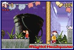 So bringen Kopfsprünge mehr als das erledigen mit dem Hut. Die Level selber zeichnen sich durch eine angenehme Größe aus und viel Interaktion. Dabei ist der Weg zum Ende zwar relativ linear, aber mit vielen Hindernissen gepflastert. Allerdings, und da ähnelt das Spiel anderen Konkurrenten, kann man die Level auch durchforsten ohne linear vorzugehen. Spätestens ab der 4. Welt sind die Level auch groß genug um sich mal zu verlaufen. So kann Feivel 100 Goldbarren pro Level finden um einen Extra Leben zu bekommen, die natürlich in alle erdenklichen Ecken des Levels verstreut sind. Extra Leben sind in diesem Spiel wichtig. Denn leider gibt es erst nach Beenden einer Welt ein Paßwort. Wer also im 2. Level einer Welt alle der anfänglich 3 Leben verliert beginnt die komplette Welt von vorn. Feivel besitzt eine Lebensleiste von 4 Herzen. Beim Ableben jedes Gegners kann man ein Herz einsammeln. Das heißt das die Gegner zwar zahlreich sind, aber selten der Grund für den Verlust eines Lebens. Dadurch spielt es sich immer flüssig und man nutzt Gegner immer wieder zum auffrischen der Lebensleiste. Grund alle Leben zu verlieren sind neben den Gegnern, die Level an sich. Hier haben sich die Programmierer viele kleine Gimmicks ausgedacht die gefallen. Neben üblichen Plattform Aktionen oder an schwingenden Seilen vorwärts kommen sind viele Level in reichlich Etagen eingeteilt die den Spieler zur Konzentration zwingen. Bewegliche Hindernisse, Fische die aus dem Wasser springen während man über sich auflösende Plattformen springt oder im Level herumfliegende Vögel, die euch zwar nichts tun, aber behindern. Springt man nach links und der Vogel ist genau vor einem fällt man wie bei einem Hindernis nach unten. Das Spiel ist entgegen dem was man beim ersten mal hören denkt recht anspruchvoll und spielt sich nicht an einem Abend durch. Dabei ist das Spiel nicht unfair. Allein die Endgegnerkämpfe in festen Arenen sind mal was anderes, da man immer wieder die Umgebung einbeziehen muß um ihn zu besiegen. Ein wenig nachdenken gehört immer dazu. Das Spiel darf auch vom älteren Publikum gespielt werden ohne zu unterfordern. Hier hat mich das Spiel positiv überrascht. Mit am meisten gefallen haben mir Grafik und Sound. Hier muß man den Programmierern ein Kompliment aussprechen. Eine Detailreiche Grafik, die in eine gute Engine gepackt wurde und auch Ebenescrolling nicht vermissen läßt. Besonders im Kanallevel ist der eingebaute Dunst am Boden Klasse gemacht. Der Bildschirm geht sauber mit und man kann per L und R Taste nach links unten rechts und im Stand auch nach oben und unten schauen. Gerade in vielen verschachtelten Leveln eine große Unterstützung. Jede Welt ist anders designt und ist grafisch sehr ansprechend. Dazu ein fröhlicher Sound, den man so nicht oft hat. Sehr passend und dem doch lustigen Charakter entsprechend hat man hier einen guten Ton gefunden. Natürlich täuscht das nicht darüber hinweg, das Feivel nicht revolutionäres ist. Ein Jump'n Run das im gesamten Spaß macht und länger vor dem Screen hält. Wem die Feivel Filme gefallen haben wird auch hier seinen Spaß haben. |