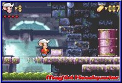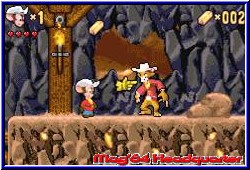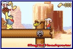 Der Jumper Markt auf dem GBA ist mittlerweile doch hart umkämpft. Auch wenn Nintendo auch mit Mario Advance 2 nichts neues bringen wird wird er den Jumper Markt sicher wieder aufmischen. Da müssen sich andere Firmen schon einiges einfallen lassen um ansprechende Software zu liefern. Swing schickt ab sofort den kleinen Feivel in's Rennen, der nun auch auf dem GBA sein Unwesen treibt. Vielen aus Trickfilmen bekannt darf er nun sein eigenes Abenteuer bestehen. Die kleine Story wird dem Spieler wieder nach dem Einschalten dargebracht. Natürlich in komplett deutsch, was man momentan kaum noch erwähnen muß. Kern der Story sind die Vereinigten Staaten und ein Gold Mine, die Wylie Burp gefunden hat. Auf genau diese Goldmine hat es der böse Bube im Spiel Cat Malone abgesehen. Im letzten Moment hat Wylie die Karte zur Mine in 4 Teile zerrissen und sie an seine Freunde im Land verteilt. Den ersten Teil bekam der kleine Feivel, der sich nun auf den Weg macht vor Cat Malone die Kartenteile und damit die Mine zu finden. Das von HokusPokus entwickelte Spiel kommt als reinrassiges Jump'n Run der alten Schule daher und bietet dem Spieler 6 Welten mit je 3 Action Leveln und einem Endgegner pro Welt. Zu Beginn kann der Spieler das Spiel starten, per Paßwort fortsetzen oder in den Optionen einen von 2 Schwierigkeitsgraden einstellen, sowie die Tastenbelegung wechseln. Beginnt man ein Spiel oder eine Welt wird diese auf der Karte dargestellt, die der Spieler mit zunehmender Spieldauer vervollständigt und somit die Level freilegt. Alle Welten werden in linearer Reihenfolge gespielt. In jedem Level ist es Feivels Ziel ein Exit Schild zu erreichen, oder im jeweils 3. Level einer Welt den dazugehörigen Endgegner. Bis dahin darf sich der Spieler auf ein bodenständiges, aber schönes Spiel freuen. Es bringt alles mit was einen guten Jumper ausmacht. Das beginnt bei einer gelungenen Steuerung. Feivel kann Springen, Laufen oder seinen Hut als Geschoß benutzen, was ein wenig an das Werfen eines Bumerangs erinnert. Man kann, einmal abgeschossen durch eigenes Springen die Flugrichtung beim zurückkommen beeinflussen. Das Springen ist in diesem Spiel kurz und auf den ersten Blick ein wenig träge. Feivel springt nicht unbedingt weit oder hoch. Allerdings passen die Umgebungen genau zum Sprungverhalten. Einzig ein wenig Kritik, das man ihn wenig in der Luft beeinflussen kann. Den Hut kann man auch in Flug schießen um sich der reichlich vorhandenen Gegner zu erwehren, die thematisch zu jeder Welt passen und sich damit unterscheiden. Auch der berühmte Hosenmatzsprung ist enthalten, was auch ein erledigen der Gegner durch einen Kopfsprung der alten Art ermöglicht. Die Art und Weise wie man Gegner erledigt wird nach einem Level auch bewertet und ergeben einen Score.