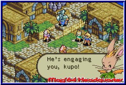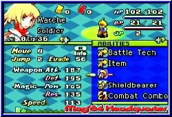 Von nun an ist es das Ziel in dieser neuen Welt bestimmte Kristalle zu finden und zu zerstören, die es Marche wieder ermöglichen in seine normale Welt zurückzukehren. Ziehe ich ein Resume was die Story angeht, so ist diese schon interessant gemacht, erreicht aber nicht den Status den man vielleicht in einem Final Fantasy Spiel erwartet. Ich empfinde sie hier mehr als Mittel zu Zweck und man tut vieles ohne groß an die Story zu denken. Zu Beginn gibt man Marche einen eigenen Namen und landet schließlich am ersten Ort der neuen Welt - Cyril. Diese Stadt ist praktisch Ausgangspunkt allen Schaffens im folgenden Spiel, das zum eines zur Genüge bieten wird. Aufgaben, Missionen und ein Umfang der dem eines Tactics Ogre in nichts nachsteht. Bevor man sich mit dem Gameplay eines RPG auseindersetzen kann zeigen sich gewisse Eckpfeiler des Spiels, die man zu Beginn wählen kann. So ist die neue Welt zunächst in einer Art Karte abgebildet. Auf dieser findet man durch Linien verbunden runde Kreise auf denen später im Spiel neue Locations entstehen. Auf dieser Karte wählt man Ortsbesuche mit einem Cursor an und geht danach praktisch für die verschiedensten Dinge in die gewählte Location. Die Stadtlocations wie Cyril, von denen im Verlauf sehr viele auftauchen bietet verschiedene Punkte an. Neben einer Taverne sind dies Läden, ein Kerker, eine Monsterfarm und später Kartenhändler und weitere spezielle Läden. Grundlage des Spielsystems in FFTA sind sogenannte Clan's. Diese Gruppen von Charakteren gibt es zuhauf in der neuen Welt und sind alles andere als friedlich miteinander. Sie kämpfen gegeneinander und versuchen sich gegenseitig Land wegzunehmen. Ihr werdet nun der Gründer eines neuen Clan's in dieser Welt und müßt versuchen neben dem Erfüllen von Missionen und dem Kämpfen gegen andere Clan's eure Macht zu erhöhen und Ansehen zu erreichen. Um zu kämpfen braucht Ihr also einiges. Das erste ist wie immer das Grundgerüst eines RPG. Eine Gruppe von Charakteren die Ihr führt. Waren es bei einem Golden Sun 4 oder 8 Charaktere, so sind hier bis zu 23 verschiedene Charaktere möglich, von denen aber maximal 6 in den Kämpfen agieren werden. So langsam finden sich gerade hier die Parallelen zu einem Tactics Ogre. Alle Charaktere im Spiel gehören einer gewissen Klasse an, von denen FFTA sehr viele bietet. Beginnend mit menschlichen Klassen wie Soldaten kommen verschiedene Varianten von Magiern vor, Schützen die Fernwaffen einsetzen können sowie z.b. Diebe, Krieger oder die sogenannten Bestienbändiger. Allen Klassen gemein sind ihre unterschiedlichen Fähigkeiten und damit Stärken und Schwächen. Das ein Soldat grob gesagt besser kämpft als ein Magier wird man auch in diesem Spiel feststellen. |