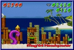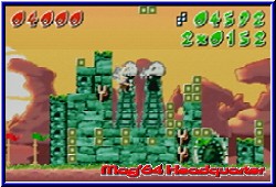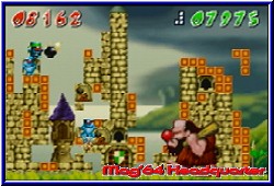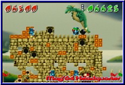 Dies geschieht wenn man viele Objekte ohne große Fehler so aufeinander stapelt, das man Bonus Punkte erhält. Rechts oben werden diese angezeigt, zusammen mit dem normalen Score. Dieser definiert das Ende des Spiels. Jedes Level in Fortress hat eine Scoregrenze. Ist die erreicht habt Ihr gewonnen. Hat man nun eine gewisse Bonuspunkte Grenze überschritten fällt anstatt eines Objektes je nach Level eine Waffe nach unten die man auf der Burg platzieren kann. Von einer Kanone über Steinschleudern bis zu Radarschüsseln reicht die Auswahl. Sind diese platziert ballern sie automatisch los. Jetzt beginnt so langsam eins in's andere zu greifen. Durch die Waffen die auch der Gegner einsetzt könnt Ihr Teile der gegnerischen Burg zerstören. Dafür gibt es Punkte und Ihr verhindert das der Gegner ordentlich weiterbauen kann. Diese Werkelei bringt im Endeffekt die Punkte, wobei eure Bauweise am wichtigsten ist. Eine stabile Burg sichert gute Angriffe. Mit der Zeit stecken beide Kontrahenten Treffer ein. Je höher die eigene Burg wird um so mehr Bonusfelder kommen zum Einsatz. Schafft Ihr es auch noch Türme zu bauen bekommt Ihr sogeannte Twerps. Diese kleinen Wesen gibt es als Defensiv und Offensiv Version. Defensiv repairieren sie die eigene Burg, während man in der Offensiv Variante die Jungs als Geschoss zum Gegner schießen kann. Jetzt per Fadenkreuz und gezielt um z.b. direkt eine Kanone des Gegner lahmzulegen. Dazu kommen bei vollendenten Türmen und Burgen Bonuscharaktere wie Drachen oder fliegende Untertassen, die verheerende Wirkung beim Gegner erzielen. Aber das dauert eh man diese Jungs hervorzaubert. Auch hierzu benötigt man die Twerps. Das Spiel ist angenehm schwer und die Kämpfe sind immer wieder äußerst knapp. Auch im Hard hat man eine Chance, merkt aber schnell das man einige Übungsstunden hinter sich bringen muß um zu gewinnen. Die Objekte die herunterfallen werden euch immer angezeigt. Negativ ist allerdings manchmal das Scrolling. Hat man die linke Seite der Burg bis nach oben gebaut und muß dann rechts weiterbauen muß man immer zeitraubend nach unten scrollen um das Objekt auch ordentlich zu platzieren. Eine brüchige Burg macht wenig Sinn. Trifft eine gegnerische Waffe Teile eurer Burg werden Steine herausgesprengt und hinterlassen kleine Trümmer für eine gewisse Zeit auf die man in dieser Zeit nicht neu bauen kann. Hier muß man teilweise schnell reagieren und drumherum bauen. Hauptsache die Statik stimmt ungefähr. So extrem das die Burg zusammenfällt wenn eine Seite komplett weg ist es aber nicht. Der Spaß steht im Vordergrund, nicht die Physik. Untermalt wird das ganze von einer netten Musik und viel Schreierei der Twerps und reichlich Kampfgeräuschen. Grafisch ist das Spiel zweckmäßig. |