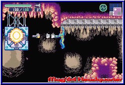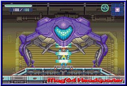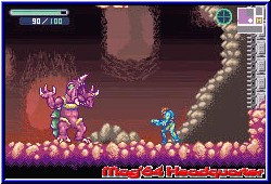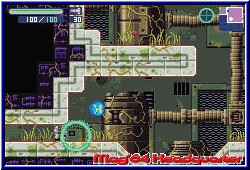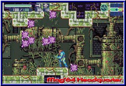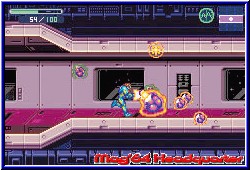 Damit sie auch einiges aushält gibt es natürlich eine Energieanzeige dafür. Oben links wird diese in Zahlenform dargestellt mit maximal 99 Punkten. Wieder genial ist auch hier die Möglichkeit dies upzugraden, in dem man sogenannte Energie Container findet. Diese werden neben der Energieanzeige als kleine Striche dargestellt. Sinn ist das jeder Container jeweils komplett 99 Lebenspunkte enthält. Ist einer leer und Ihr besitzt mehrere seid Ihr also nicht erledigt und der jeweils nächste ist nun dran. Davon findet Ihr reichlich, die eurer Anzeige angefügt werden. Genauso verhält es sich mit Waffen wir den Raketen. Auch hier kann man die maximal verfügbaren nach und nach erhöhen in dem man nun dafür die entsprechenden Container findet. Meist in Räumen versteckt, die nicht unbedingt zum Levelweg zählen ist dies nur ein Punkt warum der Spieler möglichst alle Räume untersuchen sollte. Das Spiel selber ist grob linear, das heißt die Sektoren werden nacheinander abgearbeitet. Einzig sogenannte Schleusentore die es überall gibt werden erst nach und nach geöffnet wenn der Spieler bestimmte Aufträge erfüllt hat. Teilweise knifflig ist das Finden von Wegen. Wie in Wario Land steht man ab und zu vor einem Punkt wo man kurzzeitig denkt es geht nicht weiter. Hier muß man oft selbst die harmlos aussehendsten Wände, Decken und Böden anschießen und Bomben legen und findet so doch plötzlich einen Weg. Teilweise hilft die Karte die anzeigt das es weitergehen muß, in anderen Fällen ist die Karte nicht vollständig, was es wieder schwerer macht. Die einzelnen Locations bietet nicht nur grafisch immer wieder neues Terrain, sondern glänzen auch mit eine großen Anzahl an Gegner Variationen. Für das Auge wird also auch in Metroid Fusion etwas geboten. Aha Effekte löst das Spiel aber nicht aus. Ein Castlevania 2 gefällt mir teilweise besser und bietet auch bei den Special Effekts der Zaubersprüche mehr. Aber nichts was den Spielspaß auch nur im Ansatz mindert. Das tut schon eher wieder das Speichern nur an bestimmten Punkten. Wie in Castlevania sucht der Spieler mit der Zeit immer wieder von sich auch Speicherräume auf um seinen Fortschritt zu sichern. Was mich anfänglich stört ist die Tatsache das der Spielfluß immer wieder durch die Terminals unterbrochen wird. Lange Texte die den Spieler ein wenig ungeduldig werden lassen. Was auf der anderen Seite aber klar für das Spiel spricht. Denn man kann es kaum erwarten nun endlich weiter zu ballern. Neulinge dieses Spiels werden sicher 10 Stunden und mehr für das Durchspielen benötigen. Alte Metroid Cracks schaffen dies wesentlich schneller. Nicht umsonst gibt es ein alternatives Ende wenn man das Spiel unter 2 Stunden schafft.