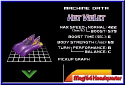 | Auch F-Zero ist eines der Spiele das zu Beginn noch längst nicht alle Geheimnisse freigibt. Sei es Strecken, Cups oder Fahrzeuge. Auch Spielmodis werden erst nach einigen Erfolgen anwählbar. So beschränkt sich das Menu am Anfang auf den Cup Modus, die Options und die Zeitentabellen, in denen euch zu jeder Strecke Tabellen der Bestzeiten angezeigt werden. Die Options bieten euch die Möglichkeit den Sound zu beeinflussen, sowie unter anderem aus 6 ! verschiedenen Möglichkeiten was die Tastenbelegung angeht zu wählen. Als letztes könnt Ihr hier die Continues innerhalb eines Cups einstellen. Von 1, 3 bis zu 5 Gleitern pro Cup reicht die Auswahl. Der Cup Modus an sich bietet zu beginn die Möglichkeit sich in den 1P Modus zu begeben, ein 1 gegen 1 Modus zu nutzen, wobei Ihr Gegner wie euch selbst einen bestimmten Gleiter zuweisen könnt sowie die Mehrspieler Modis, die erstmals einen neuen Modus mit sich bringen. Nämlich das Spielen mit nur einem GBA Modul. Wer also 4 Freunde zusammenschalten kann braucht für 4P Link Action nur ein Modul. Alle Informationen werden dann nur über dieses 1 Modul gezogen. Ein sehr kostensparender Punkt. Natürlich geht es auch über 4 Module, wobei da jeder Spieler z.b. den Gleiter einer Wahl nutzen kann. Vor allem dann wichtig wenn man einige der versteckten freigefahren hat. Wobei auch hier noch unterschiede bestehen. Es gibt 2 Modis. Entweder fährt man zu zweit über Link mit Gegnern auf der Strecke oder zu viert ohne Gegner. Zu Beginn sollte man sich aber dem schon angesprochenen 1P Modus widmen. Denn F-Zero Advance bietet recht viele Geheimnisse ,die man natürlich nur hier freifahren kann. Zuerst gelangt der Spieler hier zur Gleiter Auswahl. Zu Beginn stehen 4 Stück zur Verfügung. Hot Violet, Fireball, J.B. Crystal und Crazy Horse. Alle 4 besitzen unterschiedliche Eigenschaften. Das beginnt beim Speed, der Beschleunigung, die euch auch in einem Diagramm dargestellt wird, sowie dem Handling was in Form von Buchstaben dargestellt wird. Desweiteren gibt es wieder die bekannten Nitros in den Rennen. Auch dazu bekommt Ihr eine Anzeige. Zum einen wie lange bei jedem Gleiter die Phase der Beschleunigung anhält und zum anderen wie schnell der Gleiter in dieser Zeit wird. In all diesen Dingen unterscheiden sich die Gleiter teils enorm, was die Auswahl zu Beginn sehr schwer macht. Jeder hat seine Vor- und Nachteile. Problem ist das man in den Cups nur einen Gleiter benutzen kann und nicht innerhalb wechseln kann. Ich für meinen Teil bin den ersten Teil des Spiels mit Fireball gefahren. Schnelles Gefährt und gut steuerbar. |