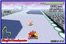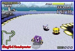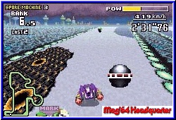 | Aber vor allem seine Nitro Zeit von 12 Sekunden sollte sich öfters als Vorteil erweisen. Hat man sich entschieden gelangt man danach zur Cup Auswahl. 3 Stück stehen am Anfang zur Auswahl. Pawn, Knight und Bishop, die alle in sich 5 Rennen bieten, die nacheinander gefahren werden müssen. Insgesamt kann man einen weiteren Cup freifahren und kommt so auf 20 Strecken im Spiel. Wählt man einen der 3 Cups anfänglich an geht es zur nächsten Auswahl. Denn alle Cups kann und muß man auch in verschiedenen Schwierigkeitsgraden fahren. Hier geht es vom Beginner über Standard bis zu Expert. Wer sogar Expert schafft darf sich im beinharten MASTER versuchen, der seinen Namen nicht umsonst trägt. Das könnt Ihr mir glauben. Aber bis dahin steht dem Spieler einiges bevor. Denn danach beginnt das eigentliche Spiel. Jede Strecke wird euch nochmal als Name vorgestellt. Englisch wie japanisch. Danach zoomt die Kamera von oben nach unten und hinter eurer Gleiter und man fühlt sich sofort an die SNES Version erinnert. Grafisch ist das Spiel nicht unbedingt besser als die SNES Version, sieht aber durch den kleineren Screen wesentlich feiner und bei weitem nicht so pixelig aus. Hier hat Nintendo ganze Arbeit geleistet. Auf dem Screen sieht man an der Startlinie 4 Gleiter gleichzeitig im Bild. Ähnlich wie in der Startaufstellung zu einem Motorrad Grand Prix. Neben euch habt Ihr es mit 14 Gegner zu tun, wobei man bei guter Fahrt die hinter euch fahrenden kaum zu Gesicht bekommt. Gefahren werden alle Rennen über 5 Runden, was zu Beginn ungewohnt ist und vom üblichen 3 Runden Turn bei anderen Rennspielen abweicht. Es gab Rennen wo ich mir gewünscht hätte das Rennen wäre nach 3 Runden vorbei und Rennen wo ich sagte gut so das es 5 Runden sind. :-) Der Screen ist wieder mit allerlei Anzeigen gefüllt wobei auch hier wieder eine Streckenquerschnitt verhanden ist der zu Beginn wichtig ist wenn man noch keine Streckenkenntnis hat. Allerdings bietet er nur euch als sichtbaren fahrenden Punkt. Eure Gegner sind nicht zu sehen. Ein wenig schade. Neben Zeitenanzeigen für Gesamt- und Rundenzeit habt Ihr eure Platzierung im Bild die auch anzeigt wieviele der 15 Fahrzeuge überhaupt noch im Rennen sind. Desweiteren die Nitro Anzeige, von denen Ihr immer bei einer Zieldurchfahrt einen neuen bekommt. Wie in allen F-Zero Spielen gibt es wieder die Poweranzeige für den Zustand eures Gleiters. Gibt es Gegnerkontakt, oder fahrt Ihr gegen die Begrenzungen oder andere Hindernisse nehmt Ihr Schaden. Ist die Leiste sogar rot wird eurer Gleiter langsamer und erreicht nur noch einen mäßigen Top Speed. |