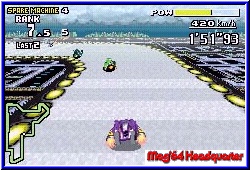 | Um diese Leiste wieder zu pushen gibt es wieder einen Abschnitt auf der Strecke in den Ihr hineinfahren könnt und wo die Leiste regeneriert wird. Auch das ist nicht unwichtig. Sogar mehrere dieser Abschnitte gibt es auf manchen Strecken. Nachdem man einen Frühstart fabrizieren kann geht die Hats auch schon los und F-Zero präsentiert sich spielerisch. Vor allem die Steuerung ist eines der Highlights im Spiel. Nicht umsonst gibt es 6 verschiedene Tastenkombinationen. Denn alles wird genutzt. A und B für die Bremse sowie die L- und R-Tasten für einen Slide. Wer allerdings denkt es reicht in Kurven den Slide zu benutzen wird sich umschauen wie oft er in der Begrenzung landet. Um wirklich ideal vor allem durch enge Kurven zu gelangen ist mehr nötig. Neben dem Einlenken ist der Slide zu nutzen und mit dem Gas zu spielen. Kurzes Gas drücken bei gehaltenem Drift sorgt alsbald für erste kleinere Krämpfe im Daumen. :-) Was am Anfang vom Schwierigkeitsgrad und der Gegnerschaft her noch relativ einfach ist wird spätestens ab Expert und den schweren Strecken richtig anspruchsvoll. Wer in diesem Spiel bestehen will sollte seinen Gleiter perfekt beherrschen. Dabei kommt dem Spieler allerdings eine Eigenshaft sehr zugute, die ich als gelungen empfinde. Es gibt im Spiel kein Punktessytem und Ranglisten. Um einen Cup abzuschließen muß man “nur“ auf jeder Strecke mindestens 3. werden. Natürlich will man alles gewinnen, sonst wäre man ja auch kein Spieler. Aber um die Geheimnisse freizuschalten reicht es. Allerdings gehe ich schon davon aus das wenn man alles gewinnt noch mehr im Spiel steckt. Mir fehlen eben gerade im Master noch einige Siege. In diesem Grad ist das Spiel sauschwer. Ich ziehe hier meinen Hut vor jedem der hier überhaupt erstmal durchkommt. Und sei es nur als 3. auf jeder Strecke. Wird man nur 4. in einem Rennen gilt das als nicht bestanden und man darf eines seiner Continues nutzen und die Strecke nochmal fahren. Versemmelt man alle beginnt man von vorn und es gibt ein Game Over. Hat man die Steuerung einigermaßen im Griff kann man auch den Speed des Spiels ordentlich umsetzen, der sehr gelungen ist. Weder Ruckeln noch sonst irgendwas trüben hier das Spiel. Technisch gibt es nichts zu meckern. Gerade mit den Nitros wird das Spiel sehr schnell und zeigt das der GBA auch hier einiges drauf hat. Dazu kommt wie schon erwähnt die grafisch typische F-Zero Umgebung. Alles ist irgendwie anmiert und sorgt für die richtige Atmosphäre. Vor allem in den Wolken Rennen sieht das irre aus wenn unter der Strecke die Wolken vorbeiziehen. Aber auch auf der Strecke ist einiges los. Ab Expert sind die Gegner auf Krawall aus und haben eine sehr gute KI. |