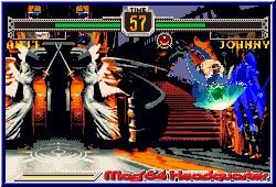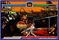 Jede Steuerkreuz Richtung in Verbindung mit einer Schlagtaste bringt je nach Stellung des Gegners einen anderen Move zur Geltung. Ihr könnt Springen, schnell laufen, Blocken und eben angenehm viele Moves ausführen. Ich habe mich hier für Venom entschieden, der mich irgendwie an einen meiner Lieblingshelden Raiden aus einem anderen Spiel erinnert. Das Scrolling ist dabei sehr sauber, ist aber durch die beiden anderen auffälligen Dinge leicht erklärbar. Mir persönlich sind die Kämpfer selber viel zu klein auf dem Screen. Street Fighter bietet gut doppelt so große Akteure. Auch King of Fighters bietet hier mehr fürs Auge. Dazu eine Grafik die mir nicht zusagt. Die Farben wirken sehr hart im Übergang. Dazu die schon bei King of Fighters bemängelte Helligkeit des Backgrounds. Manchmal ist der Kämpfer vom Background nicht zu unterscheiden. Das nimmt dem Spiel viel von seinem Potential. Denn das hat es zweifelsohne. Vor allem in den 1P Modis. Der Arcade Modus ist dabei das gewohnte Terrain. Gegen 10 Charaktere hintereinander um einen guten Score. Wesentlich mehr Spaß, auch was die Story angeht erwartet euch im Survival. Hier erwarten euch zwar ebenfalls nacheinander die Gegner. Zum einen aber sehr viele versteckte Gear's, die man in der Kämpferauswahl nicht hat und die auch im Arcade Modus nicht auftauchen. Dazu das Feature das sich euer Kämpfer hier entwickeln kann. Level Up bringt mehr Power in den Angriffen, wie auch stärkere Gegner. Je besser Ihr also kämpft, könnt Ihr immer wieder neue Charaktere sehen. Dazu sollte man aber spätestens jetzt die Steuerung und vor allem die Specials sehr gut beherrschen. Neben allen normalen Attacken gibt es natürlich auch diese in Guilty Gear X. Reines Tasten Gehämmer bringt hier wenig. Um z.b. den ultimativen Instant Kill hinzubekommen bedarf es eines entwickelten Kämpfers und einer netten Tastenkombi, die jedem Heimkonsolen Prügler ebenfalls gut zu Gesicht stehen würde. Wer auf Hard spielt und ein paar Runden übersteht darf sich ein Bienchen in's Muttiheft eintragen. Very Hard empfinde ich ein wenig übertrieben, wobei hier der Kritikpunkt mir den kleinen Kämpfern am meisten deutlich wird und man durchaus in kurzen Momenten überlegt wo der eigene Kämpfer ist, oder ob er liegt und wohin er gerade schaut. Die Tag Matches und 3 gegen 3 sind relativ ähnlich. Im Tag Match kämpfen immer 2 Charaktere in einem Team und Ihr könnt während des Kampfes durchtauschen, was im 3-3 nicht geht, dafür hier aber wie der Modus schon sagt 3 Kämpfer pro Seite kämpfen. Dazu das übliche, ist einer erledigt wird der nächste in den Ring geschmissen. Sehr sehr schade, das die Größe der Kämpfer und der grafische Background das spielerische Potential ziemlich blass aussehen läßt. Was nützen mir die schönsten Moves und Spiel Modis, wenn es an diesen nunmal wichtigen visuellen Dingen krankt. Der Sound ist Prügler typisch und darf als passend bezeichnet werden. Die Grafik eines Street Fighter und das spielerische Potential von Guilty Gear X. Das wäre die perfekte Mischung. So bleibt das Spiel leider im Mittelmaß hängen. |