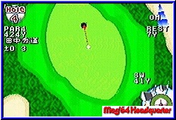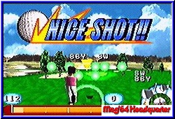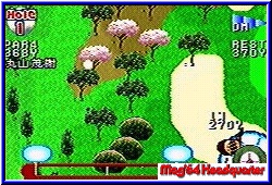 | Fühlt man sich dann bereit, darf der Turniermodus in Angriff genommen werden. Nun geht es ans eingemachte. Man spielt gegen die japanische Elite auf allen Parcouren. Hier sollte man sich schon etwas Mühe geben, um am Ende ganz vorn zu stehen. Denn wie im wahren Golfsport gibt es eine Menge Kohle zu verdienen. Und nur mit einer bestimmten Summe, kann man auf den nächsten Platz gehen. So kommt es also auch mal vor, das man ein und denselben Platz zweimal spielen muß um das Geld zusammen zu bekommen. Im Turnier Ranking behalten wir die Übersicht, wie die Gesamtwertung zur Zeit aussieht. Daran kann sich jeder orientieren, ob er noch eine Schippe drauflegen muß zum Sieg. Im Spielbildschirm selbst erhalten wir viele Informationen, die direkten Einfluß aufs Spiel haben. Oben links sehen wir die Lochnummer und darunter das vorgegebene Par. Nach Beginn der Runde, werden uns dort auch die bereits absolvierten Schläge aufgeführt. In der Mitte des Screens sehen wir die Holemarkierung für den groben Überblick. Die Gesamt- und Restweite wird uns am rechten Bildschirmrand eingeblendet. Darüber sehen wir die Windrichtung und -stärke. Im unteren rechten Eck befindet sich um den Ball unser Schlägerset. Mit der L und R Taste wählen wir einen passenden Schläger aus. Die Schlagleiste nimmt den ganzen unteren Querbereich ein. Die Skalenbreite umfaßt 100%. Vor dem Schlag muß jeder selbst die Schlagkraft selbst errechnen. Dabei nimmt man die Restentfernung und die Schlägergröße. Ist die Entfernung 230 Yard und man möchte einen 272 Yard Schläger verwenden, darf man die ganze Schlagkraft nicht ausreizen, denn dann geht der Ball dahin, wo noch kein Golfers Schuh je war. Braucht man aber mehr Power, darf man den Schläger „überreizen". Dazu hält man den Knopf bei 100% gedrückt und die Skala erweitert sich auf 112%. trifft man nun noch den Endpunkt der Skala genau, wird es ein Hammerschlag. Dann bekommt man etwas von der Sprachausgabe des Spiel geboten. Ein japanischer Kommentator führt uns zwar über den Platz, den versteht man aber nicht genau. Doch ein „Nice Shot, Nice Birdie und Nice Eagle" das versteht jeder. Grafisch kann man nichts aussetzen am Spiel. Die verschiedenen farbenfrohen Hintergründe lassen einen sich schnell auf dem Grün wohlfühlen. Ob nun im Wald, der Seenplatte oder in der Wüste, die Hintergrundgrafik besticht durch eine saubere Optik. Das Gameplay hat auch alles um ein gutes Golfspiel zu simulieren. Verschiedene Untergründe (gemäht, ungemäht, Bäume) und auch die allseits beliebten Bunker. |