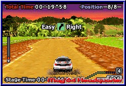 Dazu ein leicht pixelige Grafik bei der auch wieder V-Rally zeigt was heutzutage aus dem GBA rauszuholen ist. Vom GameSpeed her kann man nicht meckern. Der stimmt auch im 2. Teil wieder. Das gleiche gilt für die Steuerung. Wer mit dem ersten Teil klarkam wird auch hier schnell wieder zurechtkommen. Wobei ich hier sagen muß das sich das Setup stärker auswirkt als bei V-Rally. Waren dort die Reifen entscheidend kann man hier durch anpassen aller Werte das Fahrverhalten gut ändern. Ausgemerzt wurde ein Ärgernis aus dem ersten Teil. Streckenbegrenzungen die einen sofort stoppen und an denen man oft aneckt sind weiter weg. Auch sind Kollisionen mit Gegnern weniger kritisch als im Cross Modus in V-Rally. Im ganzen hat die Steuerung aber mehr einen Arcade Touch. Driften ist nach wie vor möglich und auch zwingend. Was mir gut gefällt ist ein Co-Pilot der per Sprachausgabe enthalten ist. Neben den üblichen Pfeilanzeigen im Screen wird jede Kurve auch akustisch angekündigt. Eine Streckenkarte während des fahrens fehlt hier. Nur eine Linie auf der Ihr als Punkt eingezeichnet seid ist vorhanden. Dazu Anzeigen zur Zeit und zum Tacho. Die Streckenlängen beider Spiele sind vergleichbar. Genau wie der Schwierigkeitsgrad. Holt man in den ersten Ländern recht zügig Gold Pokale wird es ab der Hälfte schwieriger. Vom Fahrspaß und dem Feeling her gefällt mir V-Rally 3 trotzdem besser. Dort spielt die Umgebung doch eine entscheidende Rolle. Was die Motivation angeht nehmen sich beide nicht viel. Da man jedes Land immer wieder neu fahren kann und durch neue Autos auch sollte will man schon alles sehen und gewinnen. Das kommt auch hier wieder gut rüber. Was völlig fehlt ist der Schadens Modus. Anecken, aufsetzen nach Sprüngen oder nachlassende Lenkung ist hier nicht enthalten. Ihr fahrt also immer mit dem bestmöglichen Zustand des Wagens. Federn läßt das Spiel auch im Strecken Design, die ebenfalls schwächer sind als bei V-Rally. Eckig und manchmal mit unnütz eingebauten Kurven, die flüssiges Fahren nicht immer zulassen, hätten abwechslungsreicher gemacht werden können. Ein gelungener Modus der aber hinter V-Rally zurückfällt. Der Lizens Modus beinhaltet 3 Lizensen die Ihr erfahren könnt. Jede bietet 5 Strecken. Wobei die ersten beiden Lizensen gerade mal 15 Sekunden Strecken bieten. Aufgabe ist es ohne auch nur einmal von der Straße abzukommen eine Fahrt von Punkt A nach B in genau dieser Vorgabe zu schaffen. Sind die ersten beiden Lizensen noch machbar wird's in der dritten durchaus knackig. Hier werden auch die Strecken länger aber auch die Frustgefahr steigt. Nur einmal die Straße verlassen mit einem Rad und das Rennen ist vorbei. Ungewöhnlich ist der Beifahrer Modus. Diesen müßt Ihr erst über die WM freifahren. Jetzt schlüpft Ihr in die Rolle des Beifahrers.