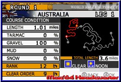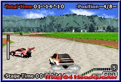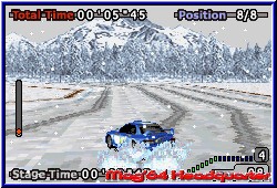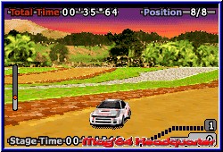 Zu jeder Strecke gibt es hier eine Übersicht über Wetter, Länge der Strecke und vor allem die Bodenbeschaffenheit. Denn auch in GT Advance 2 steht ein Setup zur Verfügung um möglichst eine gute Abstimmung zu finden. Neben 4 Reifenarten, wobei Regenreifen völlig fehlen gibt es Einstellungen für die Lenkempfindlichkeit, die Bremskraft, die Federung und das Getriebe. Auch manuelles Schalten per L und R ist hier möglich. Dieses Setup findet man auf dem Car Screen vor dem Rennen. Hier kommt man in diese Werkstatt und kann auch vor jedem Rennen einen anderen Wagen wählen. Festgelegt auf einen zu Beginn gewählten ist man nicht. Als letzte Anzeige vor einem Rennen bekommt Ihr die benötigte Platzierung im folgenden Rennen angezeigt die erreicht werden muß um zur jeweils nächsten Strecke eines Landes zu gelangen. Hier unterscheiden sich die Spiele voneinander. Beginnt Ihr auf der ersten Strecke startet Ihr immer als 12. in der Wertung. Ihr müßt nun im Verlauf aller 3 Rennen mindestens auf den 3. Platz fahren um in der Endabrechnung weiter zu kommen. Das heißt man muß im ersten Rennen mindestens auf den 9. Platz fahren, im zweiten auf den 6. und im letzten wie schon angesprochen mindestens 3. werden. Was nicht heißt Ihr dürft nicht gewinnen. ;-) Nur das bringt Autos und einen Spielmodus. Alle Strecken im Spiel sind Rally Strecken wie bei Sonderprüfungen. Das heißt auch hier fahrt Ihr nur von einem Punkt A nach B und keine Rundenkurse. Beginnt ein Rennen geht die Kamera hinter das Fahrzeug. Ihr beginnt dabei allein auf der Strecke . Gegner die überholt werden müssen kommen nach und nach in's Bild. Abstände werden auch hier durch Zwischenzeiten angezeigt. Kommen wir aber zunächst zu den beiden wichtigsten Dingen. Grafik und Steuerung. Hier war ich etwas enttäuscht. Was vor einem Jahr richtig Klasse war ist seit V-Rally 3 nicht mehr Stand der Dinge. Die Engine und grafsche Darstellung hat sich kaum geändert. Breite Strecken, die nun natürlich verschiedene Untergründe wie Schlamm oder Erde bieten. Allerdings ohne großartige Randbebauungen. Auf Straßenkursen, die es auch hier vereinzelt gibt könnte man auch denken es wäre der erste Teil. Es sind eher Kleinigkeiten. Da steht mal ein einzelner Baum an der Strecke oder ein Felsblock. Aber die Details und Randbebauungen eines V-Rally 3 erreicht GT Advance 2 nicht. Es ist nicht schlecht und nach wie vor OK. Aber es geht eben mittlerweile besser. Enthalten sind auch hier Nachtrennen, Regen oder Schnee ohne aber die grafische Umsetzung der Konkurrenz zu erreichen. Neu sind jetzt nur die Höhenunterschiede, die aber meist eher kleinen Schanzen gleichen. Auch hier fehlen die runden Höhenunterschiede eines V-Rally. |
