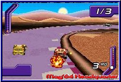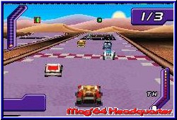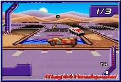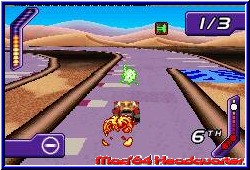 Eine schnell runterzählende Ampel gibt das Kommando und ab geht's auf die Strecke. Die Steuerung ist auch hier nichts außergewöhnliches. Gelenkt wird per Kreuz, während A und B für Gas und Bremse reserviert sind. Weitere Tasten sind die R-Taste für die Handbremse und L für das Benutzen von Items a la Mario Kart um Gegner zu ärgern. Soweit so gut. Hier beginnen aber auch schon viele Umgereimtheiten. Das erste ist die Steuerung an sich. Zunächst hat man ein gutes Gefühl, merkt aber sehr schnell das diese vor allem in den Kurven sehr träge reagiert. Der Einsatz der Handbremse um den Wagen um die Kurven zu schmeißen ändert dies nur bedingt, da man diese nur für leichte Kurven nutzen sollte. Nur das dort auch normales Einlenken reicht. Gerade für enge Kurven, wo man die Handbremse wesentlich besser gebrauchen könnte ist das Timing zwischen dem Nutzen der Handbremse, dem daraus folgenden Drift samt Gegenlenken und halbwegs sauber aus der Kurve kommen zu schlecht gelungen. Man dreht sich fast immer dabei und eckt dazu sehr oft an den Streckenbegrenzungen an. An sich sind die Designs durchaus gelungen, kranken aber an den nicht vorhandenen Auslaufzonen. Dazu bleibt man fast abrupt stehen wenn man die Bande berührt, oder was noch ärgerlicher ist man schnippst wie ein Geschoß von der linken Bande zur rechten und wieder zurück. Alles andere als flüssig läßt sich das Spiel zocken. Dazu kommt eine ungenügende Kollisionsabfrage bei Gegner Berührungen. Während die Burschen meist sofort weiterfahren, fangt Ihr wenn überhaut erstmal an zu beschleunigen. Was auf Rookie noch mit Chance lassen abgeht wirkt sich in den beiden höheren Graden viel mehr aus und sorgt für ständiges Hinterherfahren. Das man trotz göttlichem Fahren keinen Vorsprung herausfährt senkt einfach den Anspruch im Spiel. So nach dem Motto "bringt eh nichts". Was mich ebenfalls stört ist zwar kein Fehler des Spiels, aber eher eine Gewohnheitssache. Es gibt auch zahlreiche Sprünge auf den Strecken. Hier soll man nun wenn möglich einfache Stunts ausführen. Einmal in der Luft drückt man das Kreuz in eine Richtung und der Wagen macht eine Drehung. Man sollte danach sauber wieder landen und erhält einen Boost Bonus, der links oben im Screen angezeigt wird. Wer aber einmal F-Zero gespielt hat der hat im Blut eine Bewegung, das man nach einem Sprung schon automatisiert das Kreuz in die Richtung drückt, in welche die Kurve nach der Landung mündet. Hier dreht sich aber der Wagen sofort und man landet fast immer auf dem Dach oder der Seite. Das ist echt eine extreme Gewöhungssache. Das man nach einem solchen falschen Aufkommen 3 Sekunden warten muß bis der Wagen wieder hingestellt wird macht das ganze auch noch spielerisch richtig nachteilig. Leider paßt sich die Grafik dem ganzen sehr an. |
