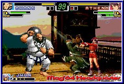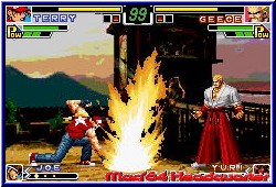 Etwas ungewöhnlich kommt auf dem GBA der Prügelmarkt daher. Sorgen doch vor allem Spiele der Konkurrenz für blutige Nasen. Tekken ist ja nicht gerade des typische Nintendo Spiel und auch King of Fighters bringt nicht gerade eine lange Tradition von einem Nintendo System mit. Nun, vor Jahren auf dem NeoGeo und anderen SNK Maschinen zuhause hat man die Spiele mittlerweile auch auf andere Plattformen verteilt. Nun auch auf dem GBA, für deren Umsetzung die Schmiede Artoon verantwortlich ist. Nichts destotrotz bleibt King of Fighters ein Prügler der alten 2D Zeit und stellt sich somit Spielen wie Street Fighter entgegen. Der Zusatz Neo Blood hat übrigens nichts mit diversen Flüssigkeiten zu tun. Wer also auf Blut steht bleibt bei Tekken Advance. Das Spiel ist neben Einzelspieler Action auch für 2 Spieler ausgelegt und bietet dementsprechende Modis an. Das Hauptmenu offeriert dem Spieler 7 Spielmodis, die sich in 5 Einzelspieler und 2 Mulitplayer Modis aufteilen. Dazu erwarten euch die Options im komplett englisch gehaltenen Spiel. Hier stellt man einen von 3 Schwierigkeitsgraden ein, das sogenannte Striker System und ganz wichtig die Button Belegung. Hier kann man wählen aus 3 oder 4 Tasten Action die sich dann auf die A und B Taste sowie L und R beziehen. Desweiteren kann man hier für alle Spielmodi im Einzelmodus die eigenen Rekorde anschauen sowie die auf Batterie gesicherten Daten löschen. Einen ersten Kontakt mit dem Spiel holt man sich im Trainings Modus. Sehr schön gemacht wählt man hier einen Kämpfer aus 18 anwählbaren Charakteren aus. Danach kann man im Training die Aktion des gegenüber einstellen. Ob er einfach nur stehenbleiben soll oder auf Teufel komm raus blocken und angreifen soll. Lohnenswert auf jeden Fall. Der sogenannte Striker wird in allen Modis mit ausgewählt und stellt grob gesagt einen Retter oder die schnelle Eingreiftruppe dar. Seid Ihr im Kampf angeschlagen kann man diesen per Tastenkombi rufen und läßt ihn kurz für sich arbeiten. Eine Absicherung ist es aber keineswegs, sondern mehr eine kurzzeitige Verstärkung. Aber trotzdem ein feines Feature. In den Options stellt Ihr die Anzahl dieser Attacken von 3-5 ein. Vom Gameplay her erwartet den Spieler altbekanntes. Ziel ist es die gegnerische Energieleiste auf Null zu bringen, bevor der Gegner dies mit euch tut. Dabei kann man im Spiel auf angenehm viele und vor allem sich auch auswirkende Moves zurückgreifen. Vom einfachen Schlag und Tritt, die es in verschiedenen Wirkungsgraden gibt sind einige Specials enthalten die sich auch gut ausführen lassen. Dazu kann man den Gegner packen und werfen oder sonstige böse Dinge tun, Blocken und natürlich durch schräges nach oben drücken des Kreuzes auch springen. In der Luft sind ebenfalls Moves möglich.