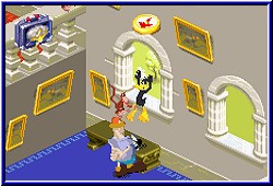 Nur verliert man halt doch immer wieder mal ein Leben und Continues und man ist sehr verärgert wenn man plötzlich alle verloren hat und das Level nicht fertig ist. Das bringt die meisten Abzüge an der Wertung eines ansonsten spaßigen Spiels. Man hat zwar versucht dies durch Bonuslevel zu entschärfen, in dem man Banknoten sammelt und bei bestimmten Grenzen Warps freischaltet um in den folgenden Bomusleveln Extra Leben zu erspielen. Allerdings zu selten und dazu meist sehr riskant zu erreichen. Man verliert gerne mal ein Leben auf dem Weg dorthin um eines zu gewinnen. Ist also nicht immer ein Nutzen. Die Steuerung der beiden ist gelungen. Auch bei Iso Sprüngen freundet man sich schnell mit der gewünschten Steuerart an. Schön das die Charaktere Schatten nach unten werfen um gerade bei heiklen Sprüngen z.b. auf fahrende Plattformen zu sehen wo man landet. Sie reagieren angenehm direkt, was bei plötzlich im Bild auftauchenden Gegner ganz gut ist. Grafisch und vom Sound her ist das Spiel ebenfalls sehr passend gemacht. Lustige Animationen der Helden und verspielte Levelumgebungen mit vielen kleinen Details erfreuen das Auge. Der eine oder andere dumme Spruch lockert das ganze auf, auch wenn man dies nur per Texteinblendung zu sehen bekommt. Stimmige Musik der fröhlichen und lockeren Art begleiten den Spieler auf dem Weg zum Ziel. Nur ist das eben etwas tricky. Kommt man gut durch kann man auch ohne Nutzen aller Continues ein Level beenden und das Spiel entwickelt seinen für dieses Genre typischen Reiz. Aber wehe man erlebt den Game Over Moment vor dem Ende einer Welt. Dann wird Looney Tunes Back in Action zur Spaßbremse und man macht den GBA erstmal aus.
